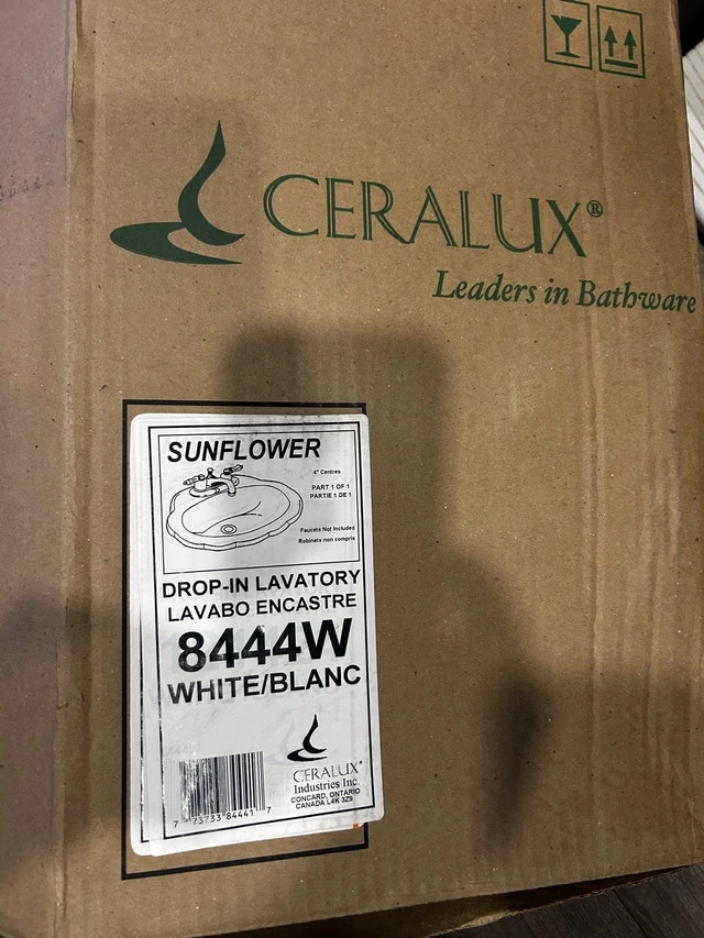 Brand new in box! This is a beautiful Ceralux "Sunflower" oval drop-in lavatory sink in classic white. It features a unique decorative scalloped/ridged edge that adds a high-end, vintage look to any vanity. Model: 8444W. Type: Drop-in (top-mount) for vanity countertops. Faucet Drilling: 4" centers (standard centerset/minispread). Condition: Perfect, never installed, still in original box. Dimensions: Standard oval size (approx. 20" x 17"). Perfect for a bathroom refresh or a new vanity project! Pickup in Beaverton. Have several if you need more than one.