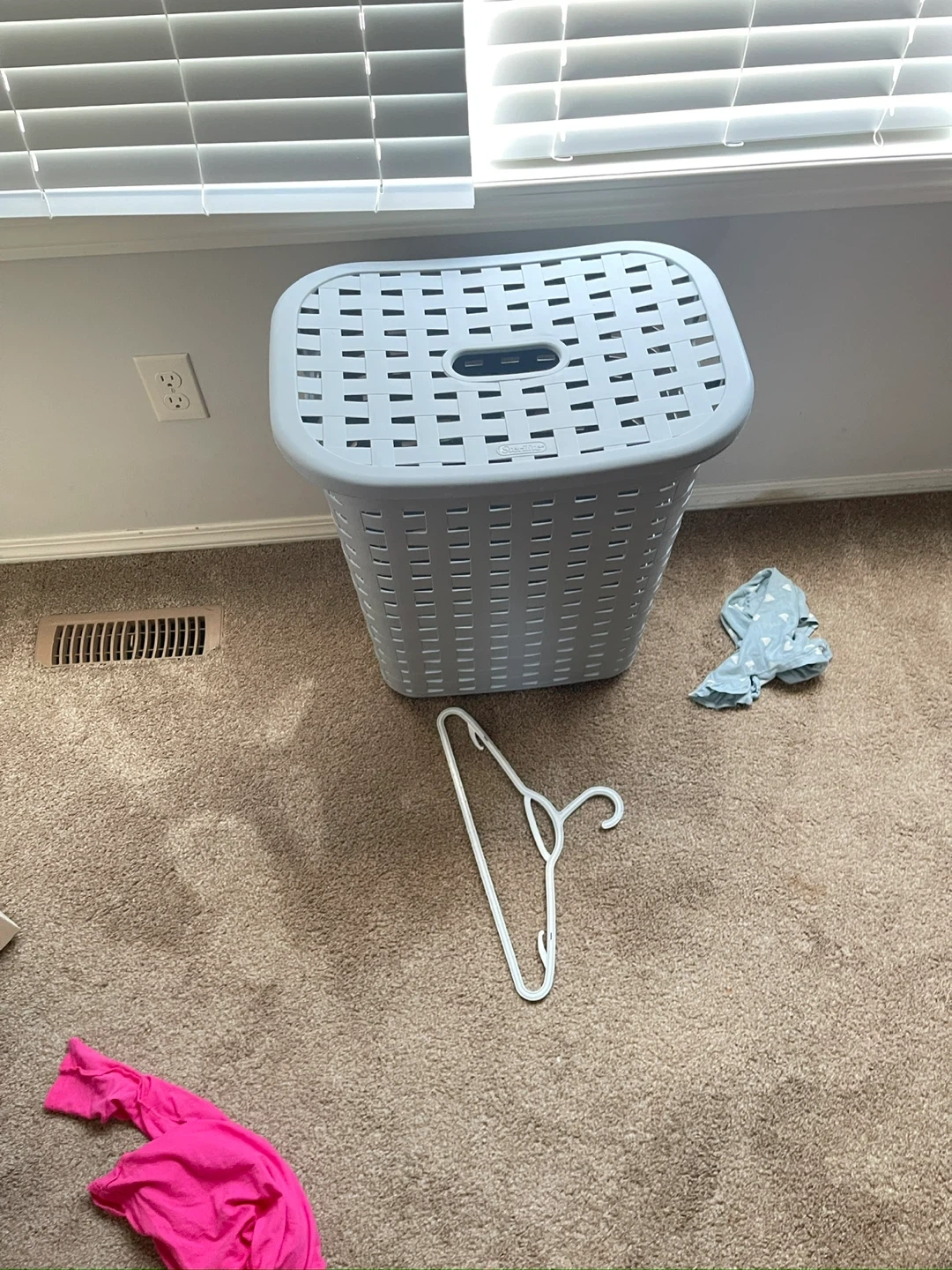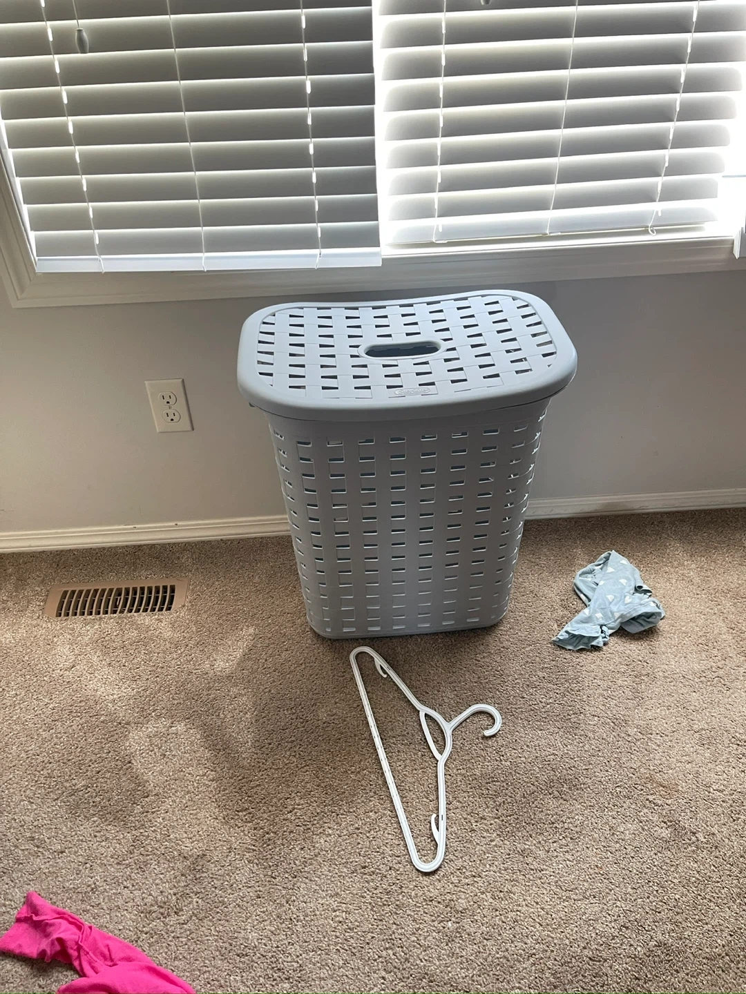 This grey laundry basket is made of durable plastic with a woven design. It features a lid and convenient carrying handles. It's a practical storage solution for clothes.