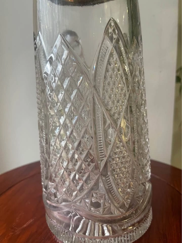 Beautiful vintage pitcher with an all-around cut glass design. Features an ornate silver plated metal top with a spout. Great for serving drinks or as a display piece.