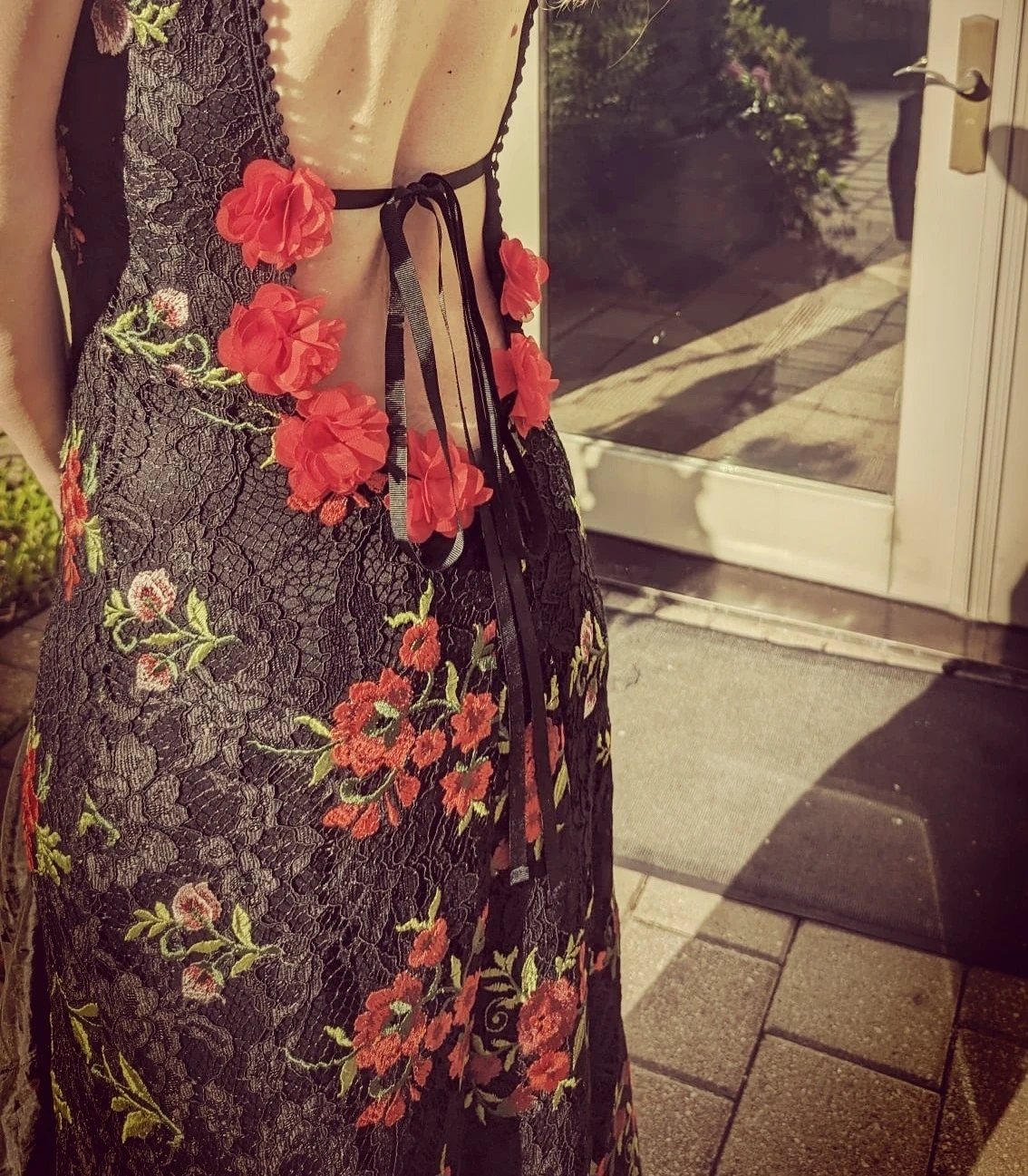 Black Lace Dress with Red Floral Appliques