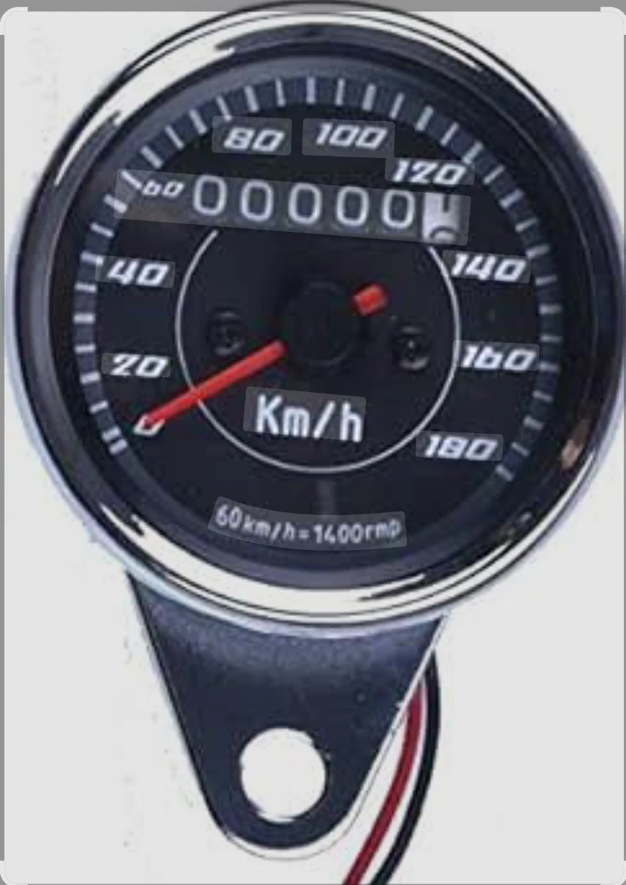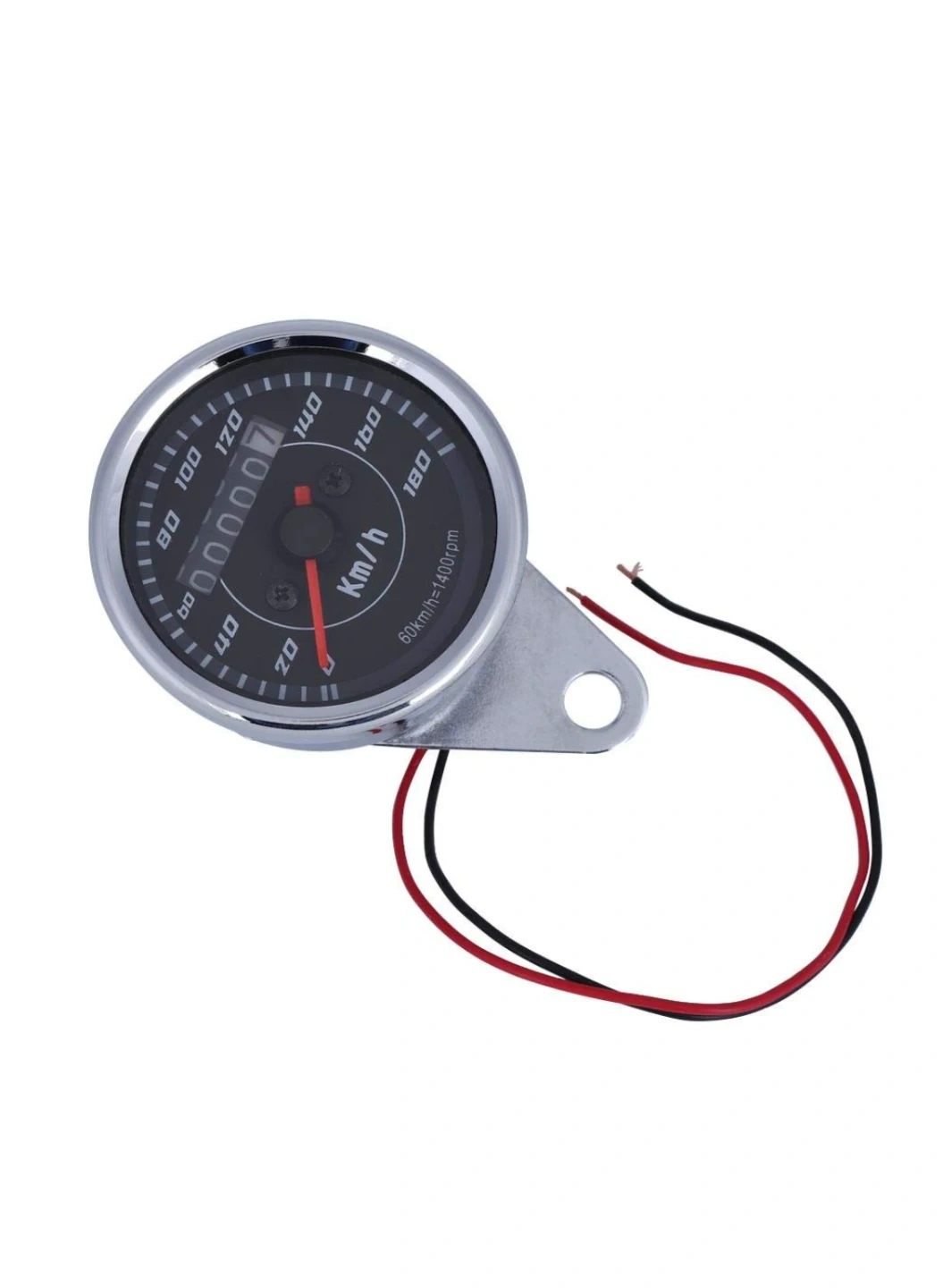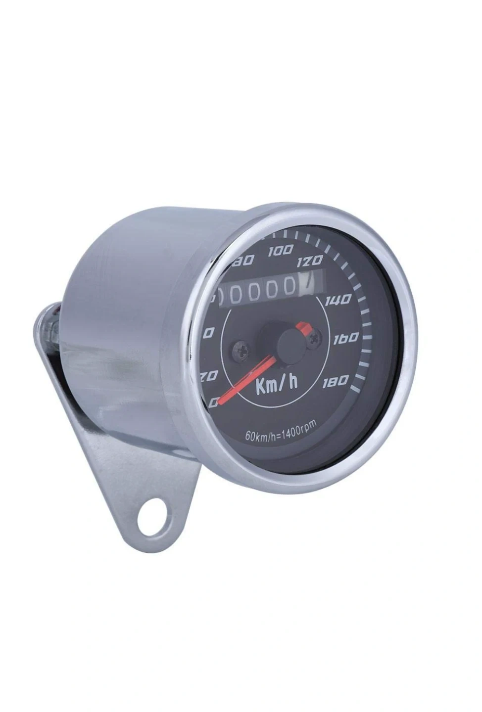 This is a universal motorcycle speedometer with an odometer. It features a backlit display for easy reading day or night. The unit reads in Km/h and includes a 60 km/h = 1400 rpm ratio.