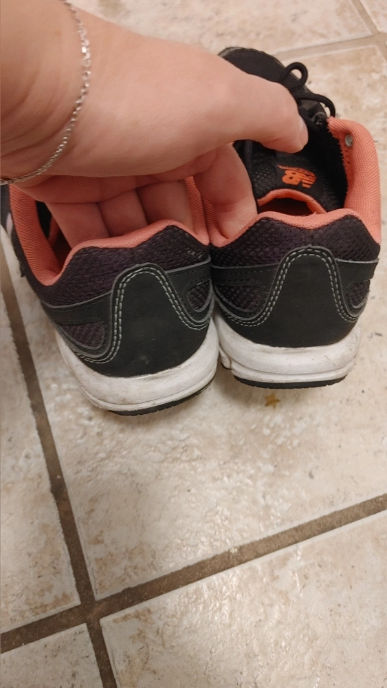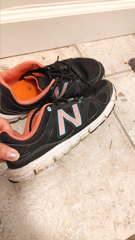 These are black Balance running shoes with coral and light blue accents. They have mesh uppers and rubber soles. Great for your daily jogs or workouts!
