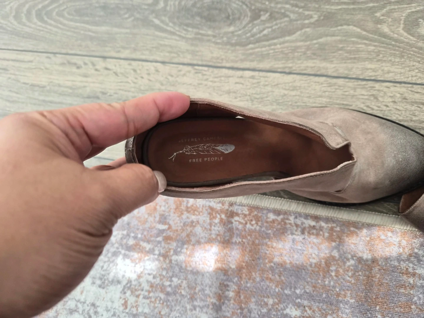 Stylish taupe suede booties from Jeffrey Campbell and Free People. These feature a pointed toe and a comfortable block heel. Size is 9.5.
