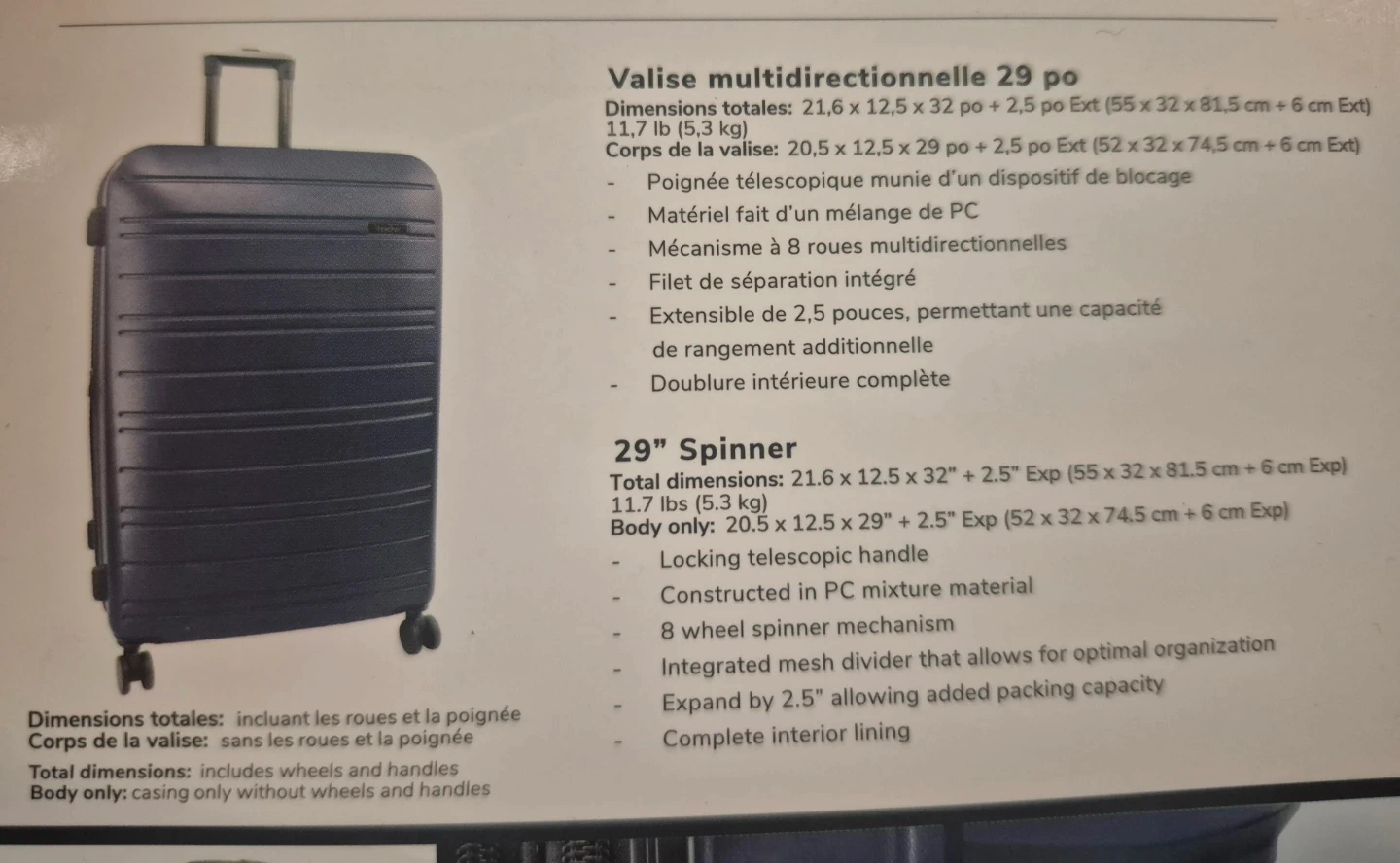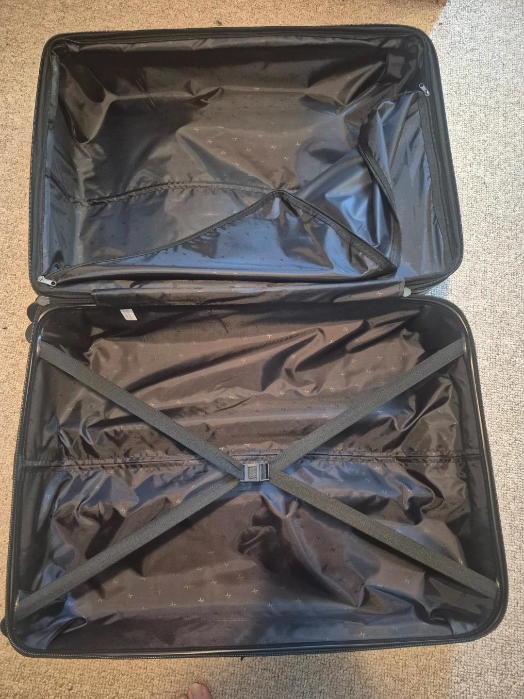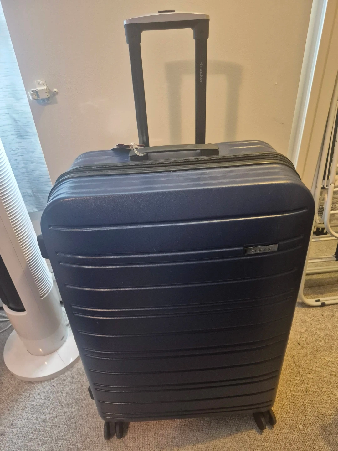 This is a navy blue hardside suitcase by Tracker. It's made of durable material and features four spinner wheels for easy manoeuvring. The interior has tie-down straps to secure your belongings. Only used a couple times. Pretty much brand new.