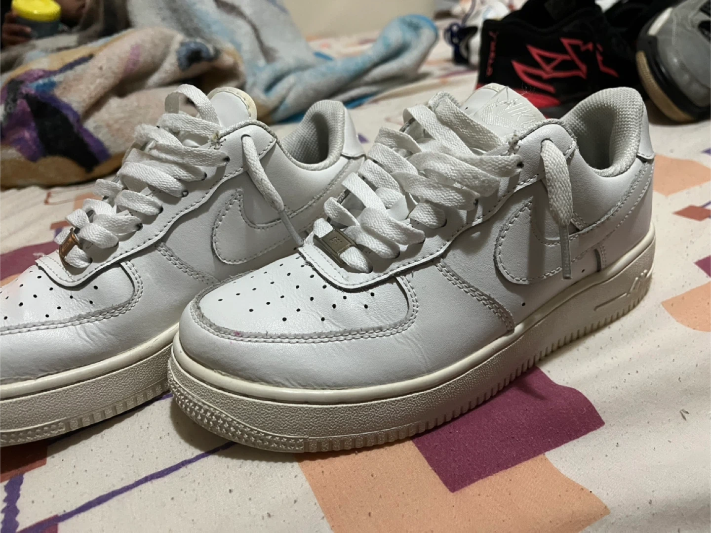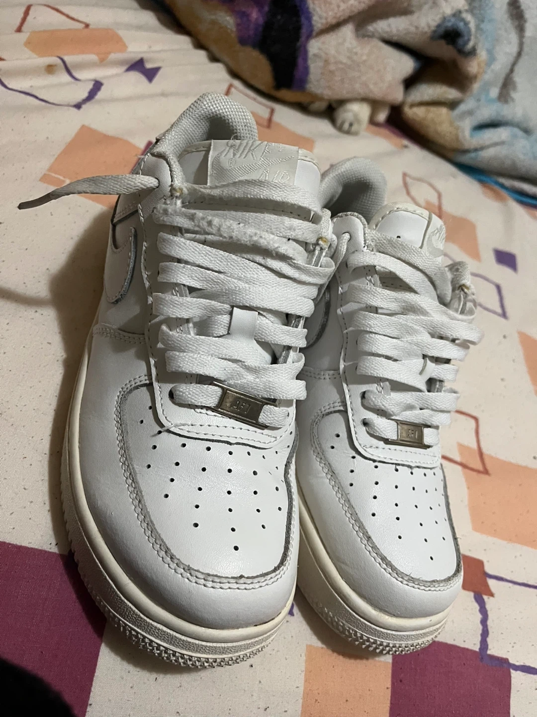 Classic white Nike Air Force 1 sneakers. These iconic shoes are made with leather. They feature a lace-up closure for a secure fit. Great for everyday wear!