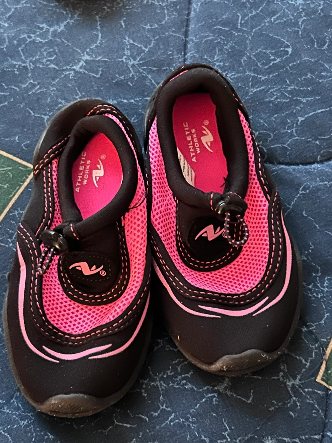 These Athletic Works water shoes are perfect for beach days or poolside fun. They're black with bright pink mesh accents and a quick-tie bungee system. Made with durable synthetic materials for active kids.