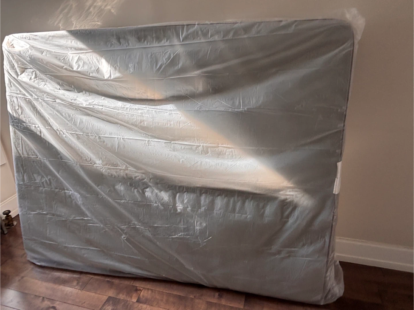 This is a queen size mattress, still in its original plastic packaging. It's a neutral gray color. This mattress is ready for a new home!