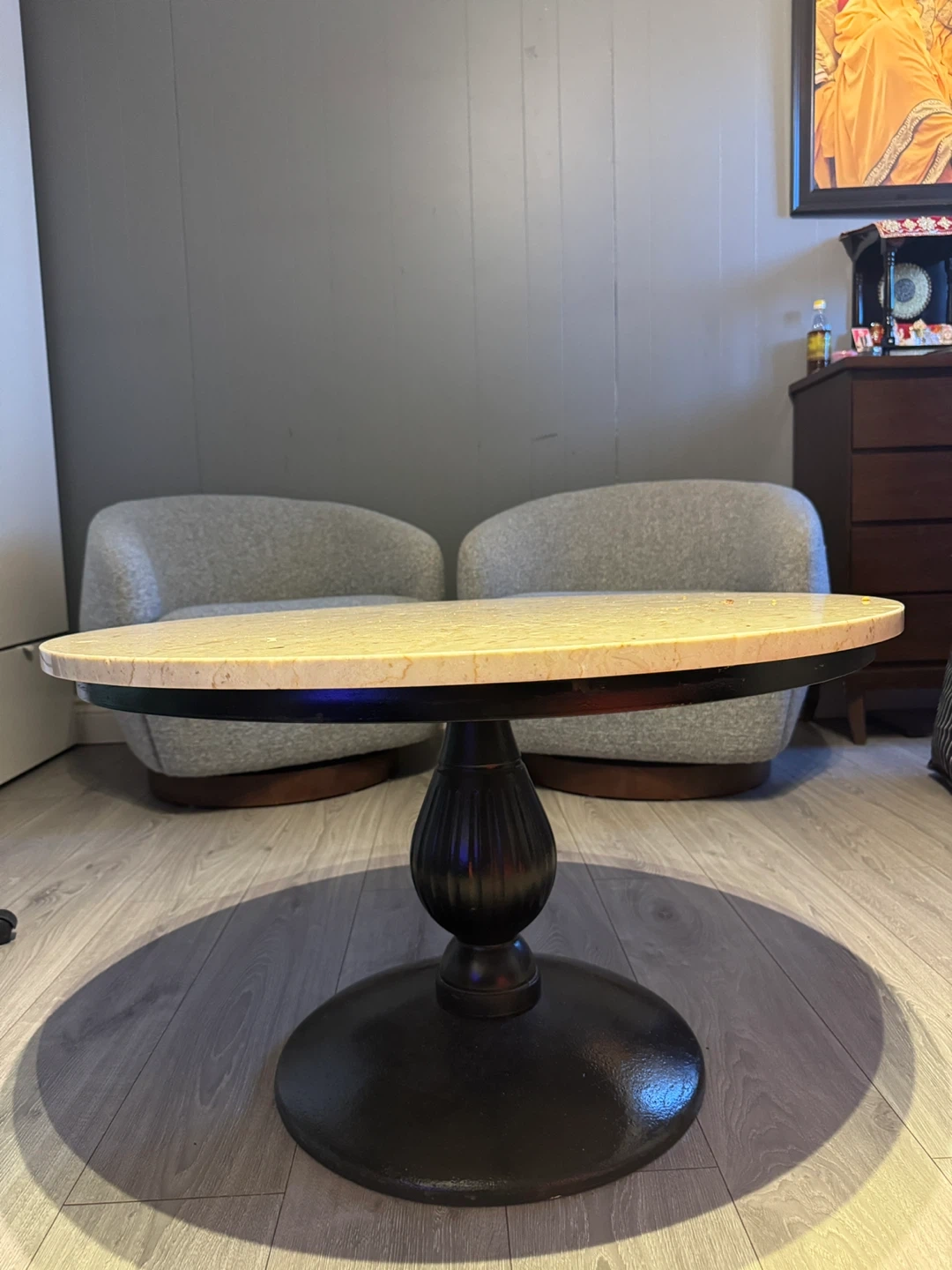 A stylish round coffee table with a beige marble top and a dark pedestal base. It's approximately 18 inches in height and 24 inches in diameter. This table's classic design makes it a great centrepiece for your living room.