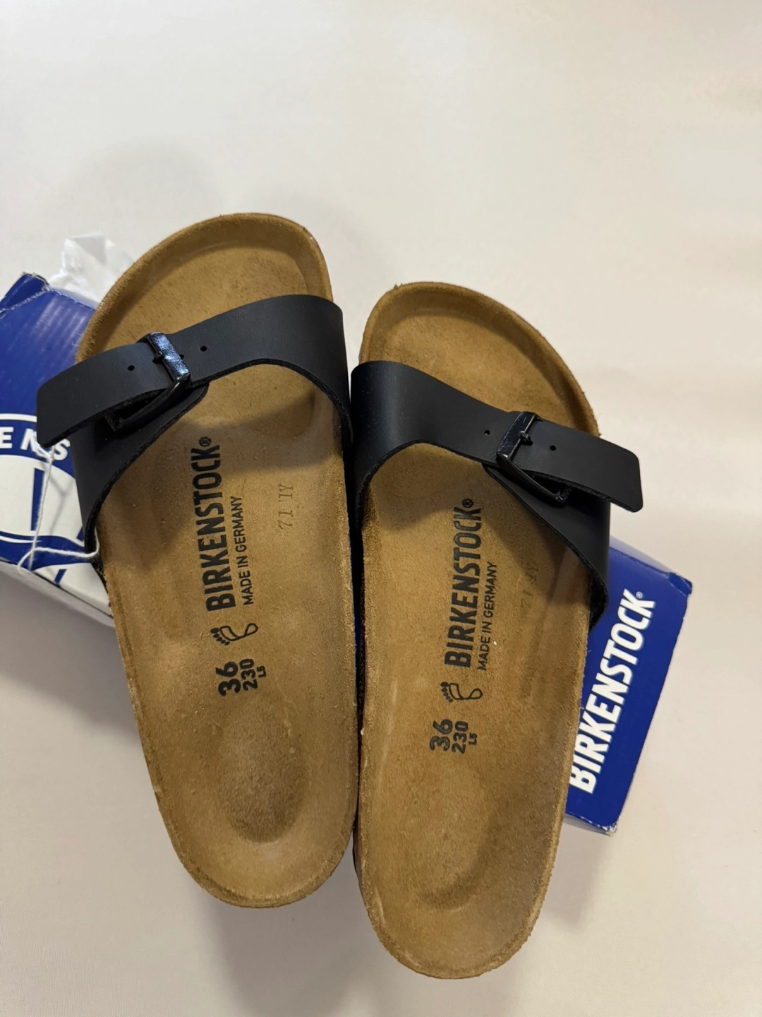 Selling a pair of Birkenstock Madrid BS sandals in black, size 36. These sandals feature a leather insole and Birko-Flor upper. They come in the original box. Perfect for a comfortable and stylish look!