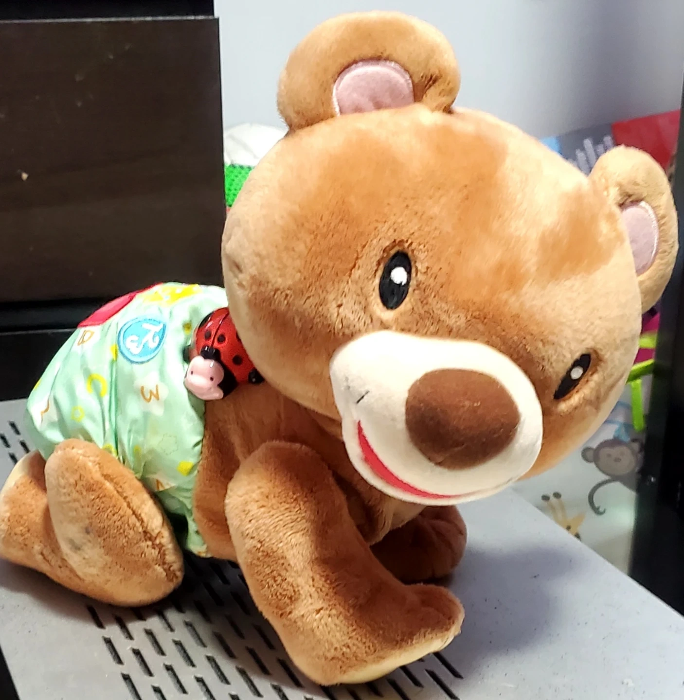 A soft brown teddy bear plush toy. It's wearing a light green diaper with a ladybug design. The bear has embroidered features and a friendly smile.