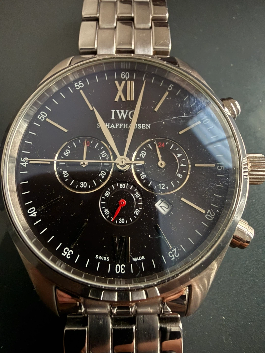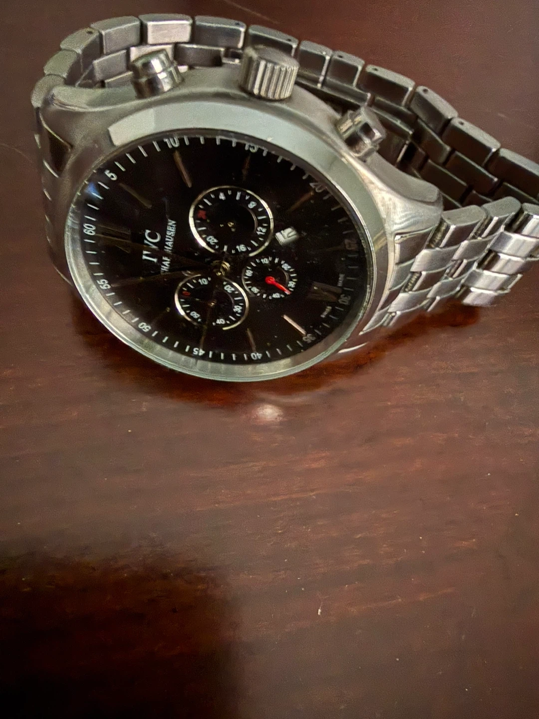 Selling an IWC Schaffhausen Chronograph watch. It has a blue face and a stainless steel band.