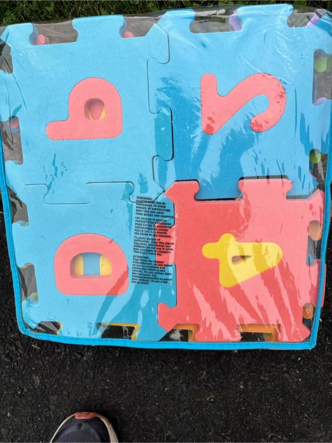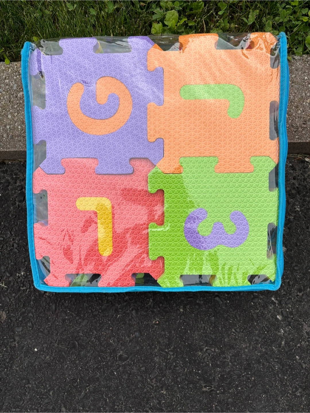 Here's a colourful foam puzzle play mat, perfect for little ones learning their numbers and shapes! The mat is in great condition and comes in a convenient carrying case. It's soft, durable, and provides a safe play area for your child