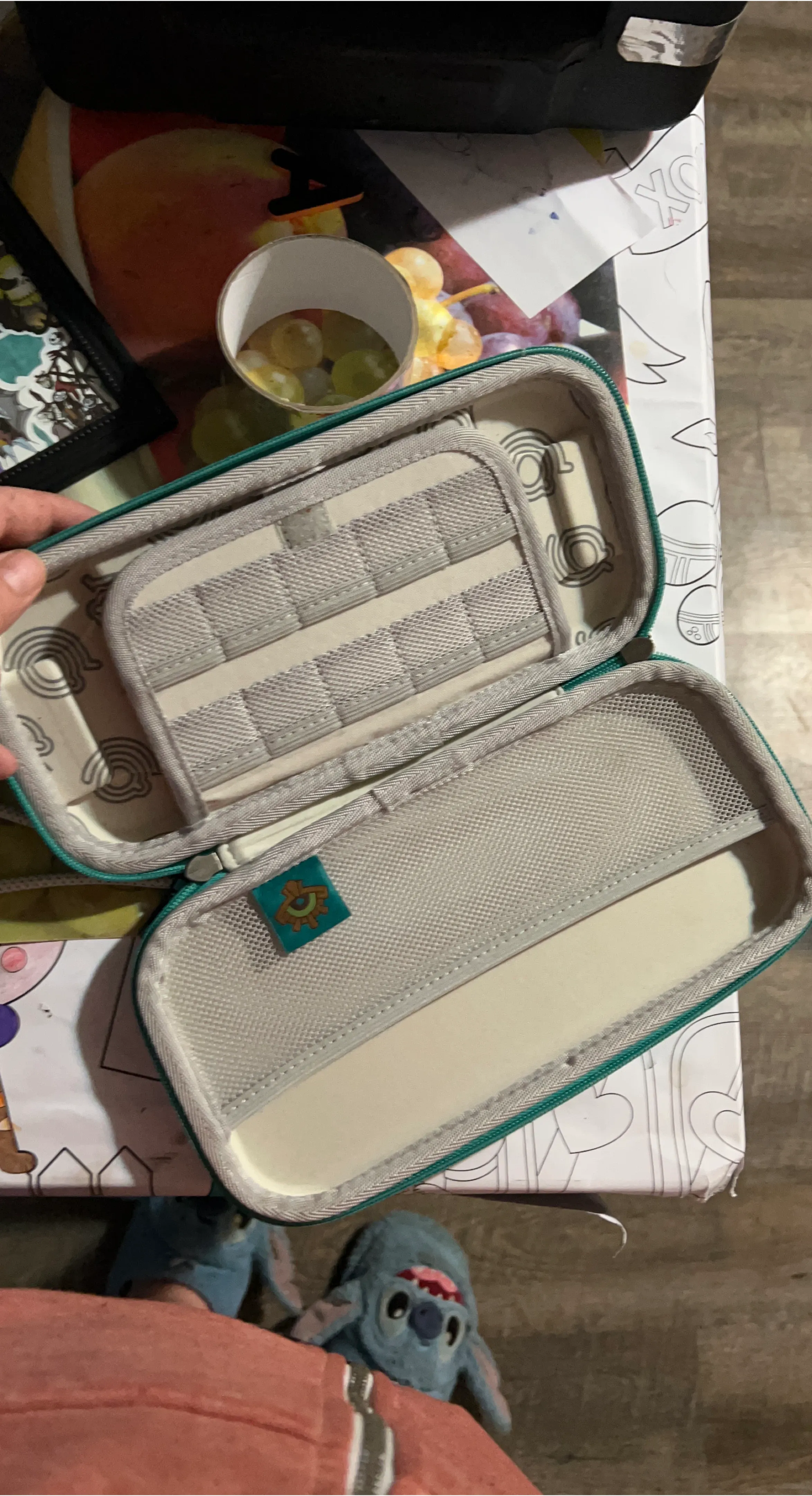 This is a teal and grey zippered case for Nintendo Switch games and accessories. It features elastic straps inside to hold cartridges securely and a mesh pocket for extra storage. It's great for keeping your games organized on the go! I currently have two available. Message for pickup location.