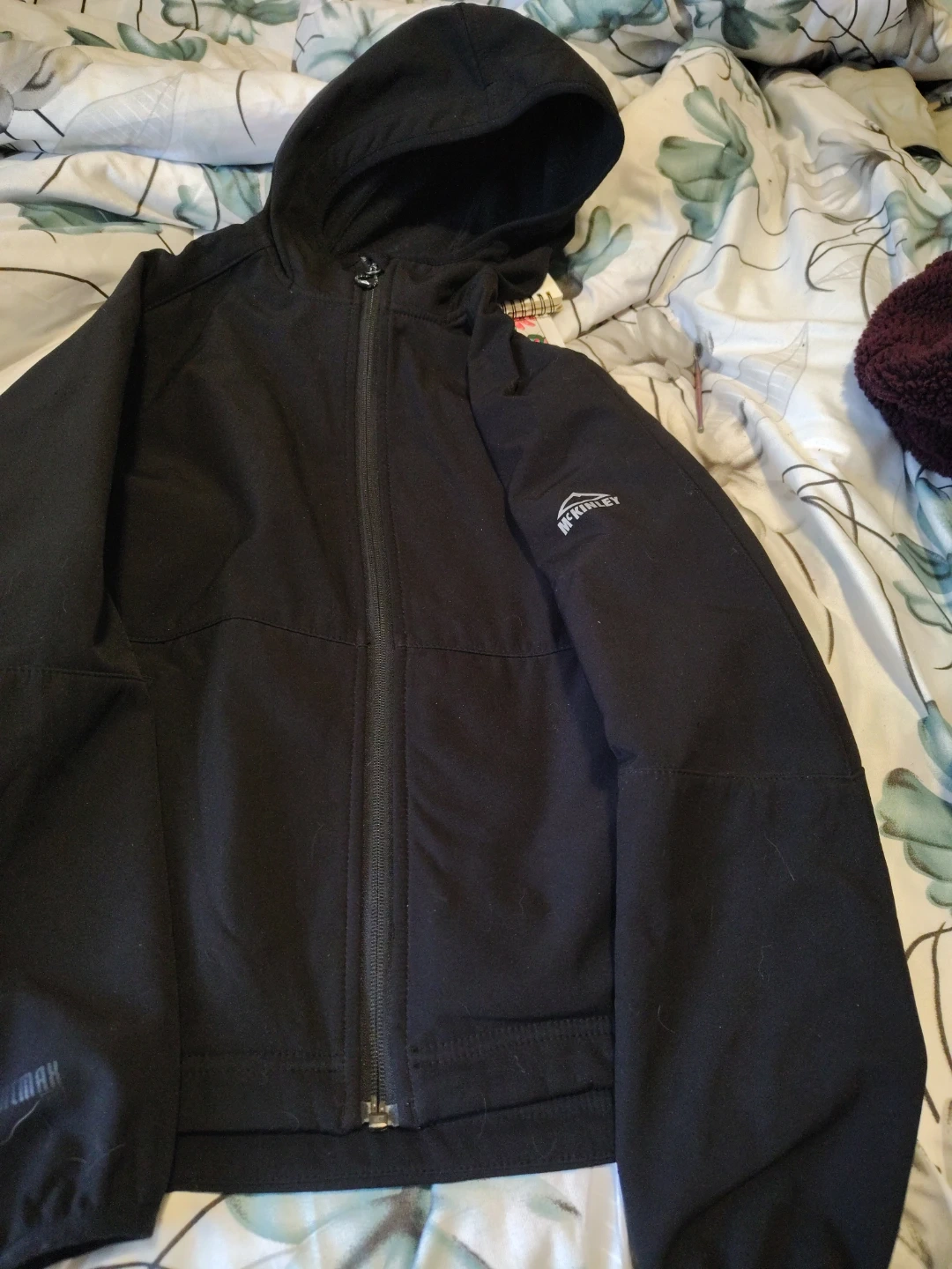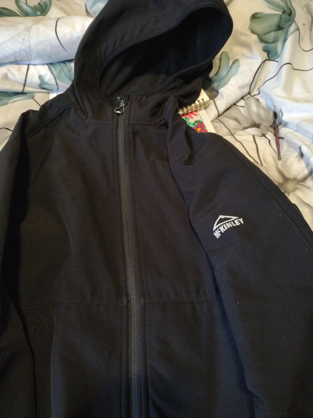 This is a McKinley black hooded jacket with a full zip. It's a size large (L/G) and features the Ventmax technology. This jacket is great for outdoor activities or casual wear.