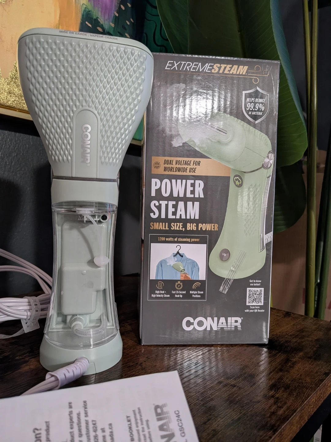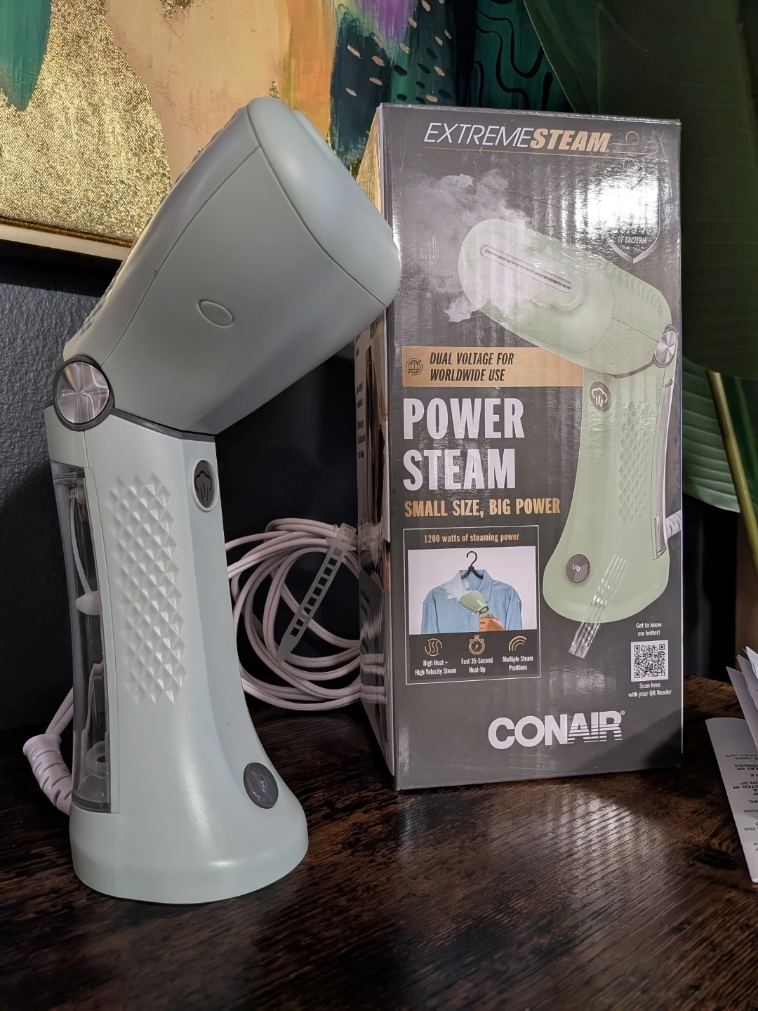 This Conair ExtremeSteam Power Steam handheld steamer offers 1200 watts of steaming power. It's designed for worldwide use with dual voltage. The unit heats up quickly, providing high heat and high steam output.