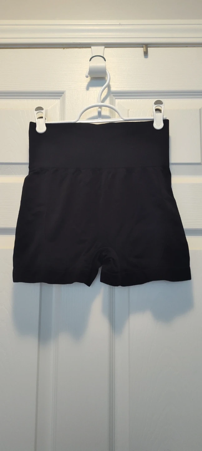 These seamless shorts are black and high-waisted. They're made from a stretchy material for comfort. These shorts are great for layering or for workouts!
