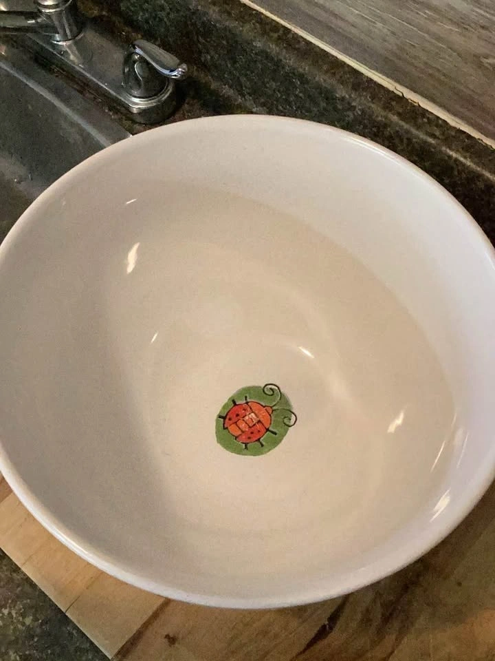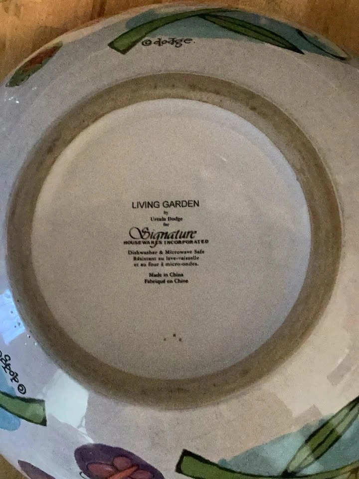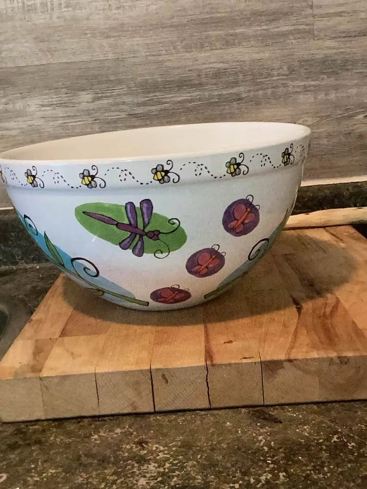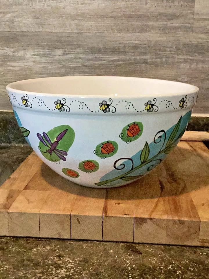 Beautiful Ursula Dodge stoneware mixing bowl featuring the Living Garden Dragonfly design. A lovely addition to any kitchen.