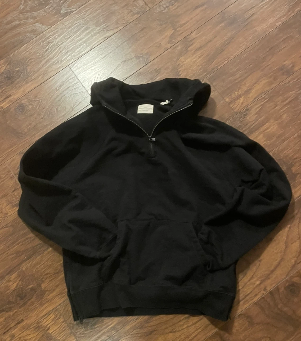 85Selling a FOG (Fear of God) Essentials half-zip hoodie in black, size medium. has side zippers. It's made of 100% cotton and has a cool, relaxed fit.
