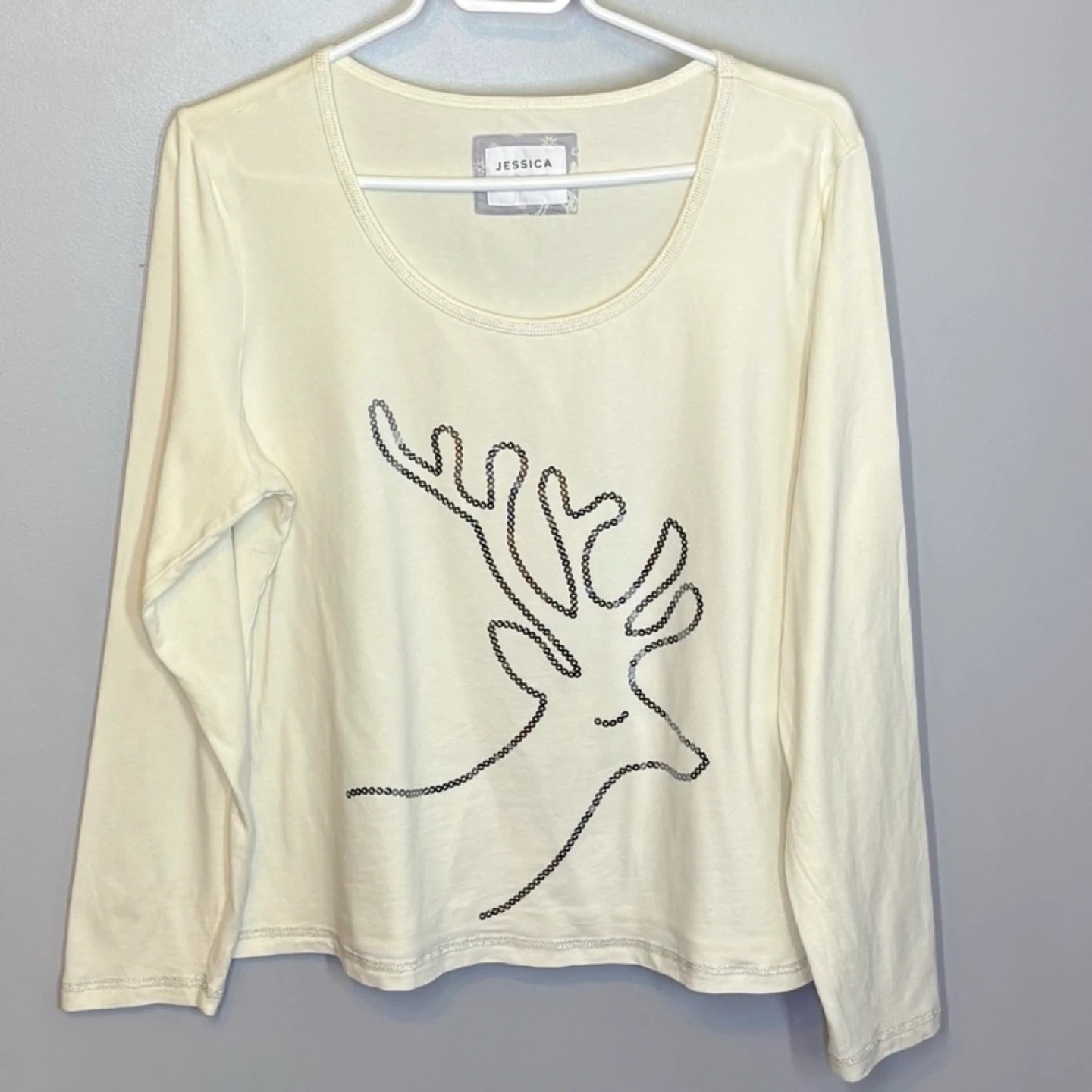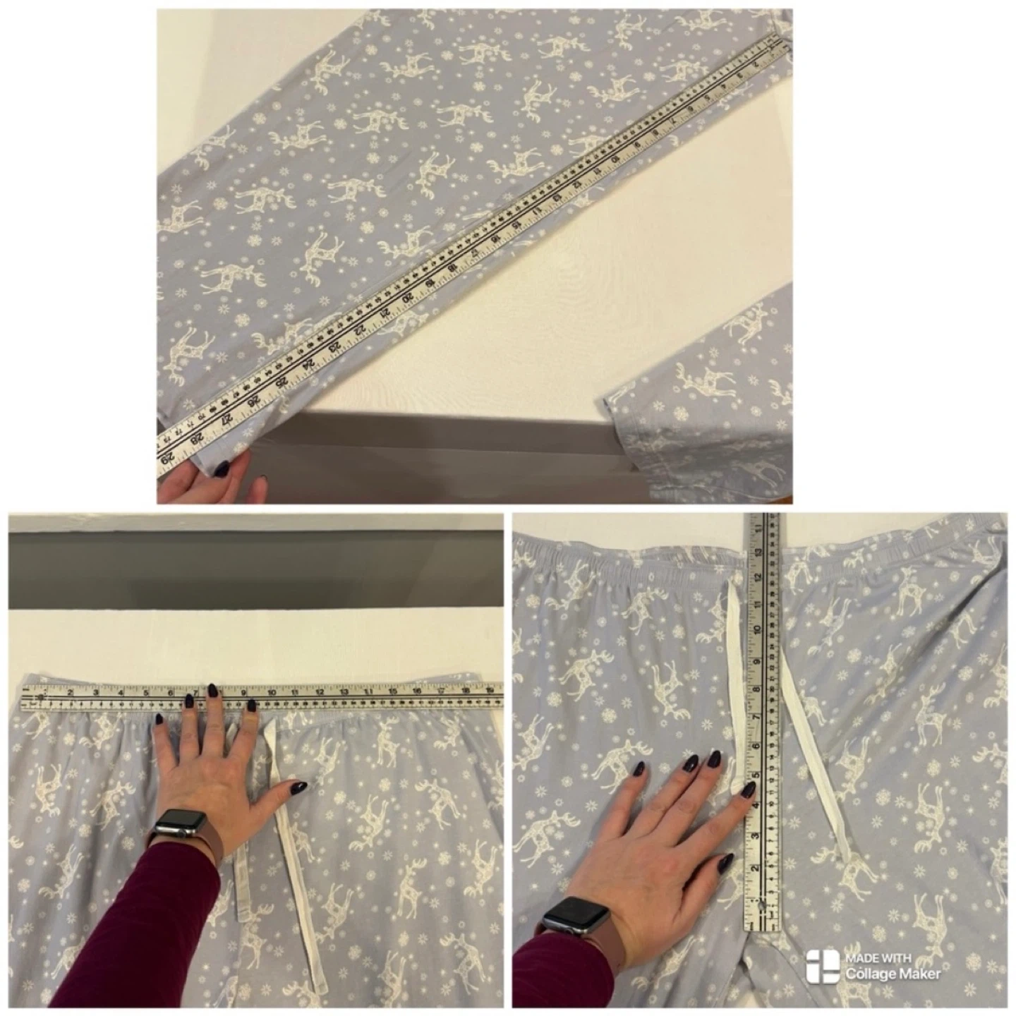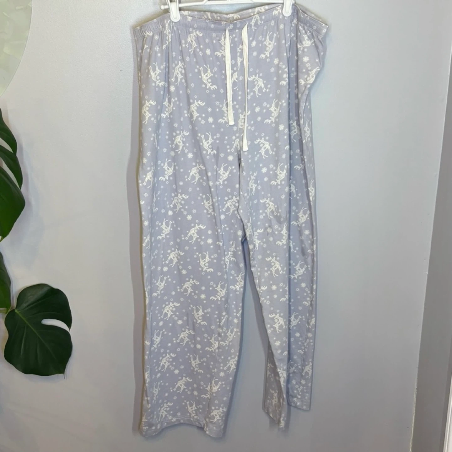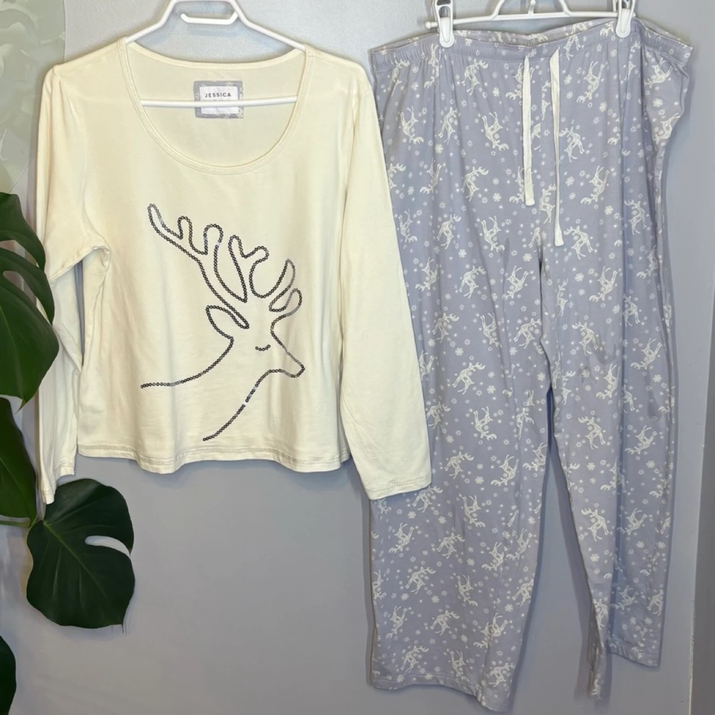 Jessica, pajama set, reindeer, sequin, holiday, Christmas, winter, lounge wear, sleepwear, XL, size 18, cotton blend, loungewear, patterned, snowflake, blue, cream, festive
