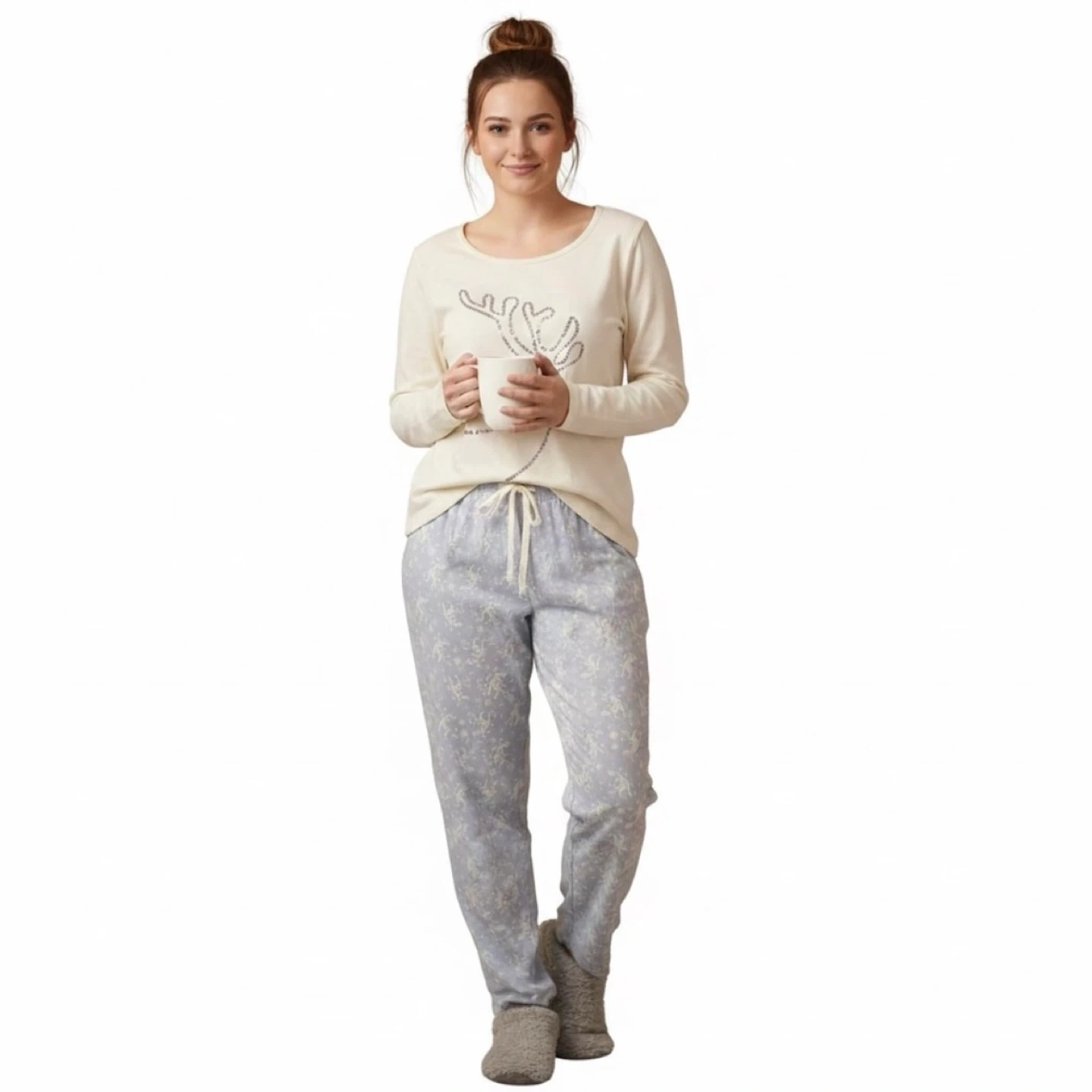 Cozy up in this adorable Jessica two-piece pajama set, featuring a long-sleeve cream top with a sparkling sequin reindeer graphic and soft blue patterned pants with a comfortable elastic waist and drawstring. Perfect for the holidays and cold weather.