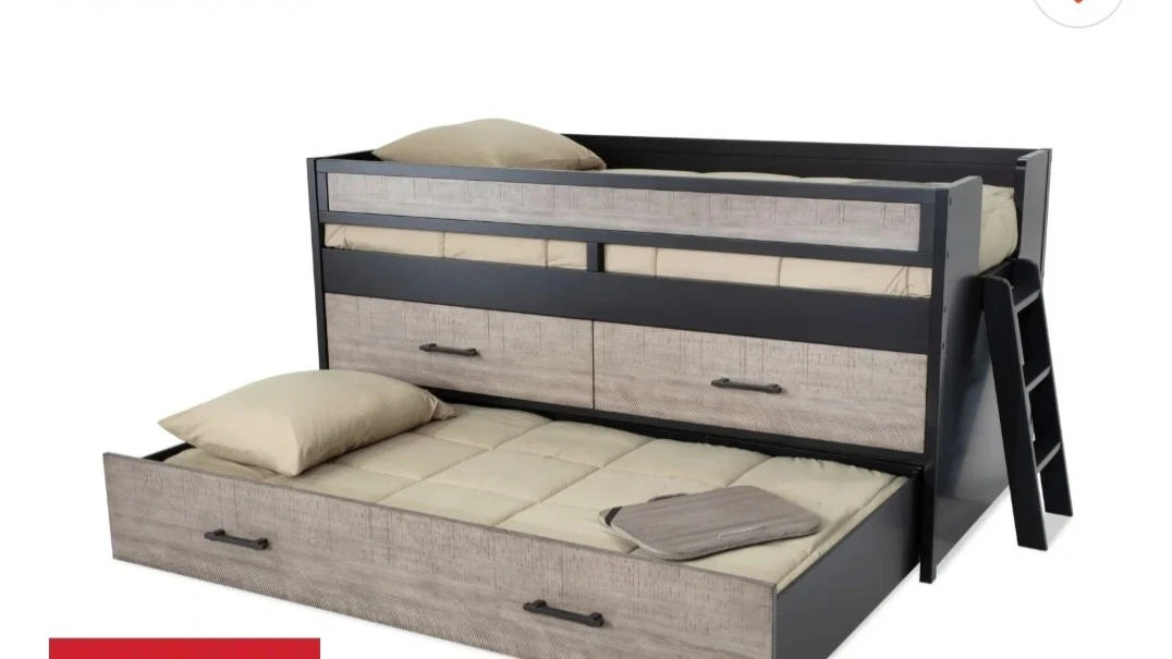 This twin loft bed features a stylish design with two drawers and a pull-out trundle. It's constructed with durable materials and includes a ladder for easy access. Perfect for saving space in a bedroom! Two twns mattress. Never used
