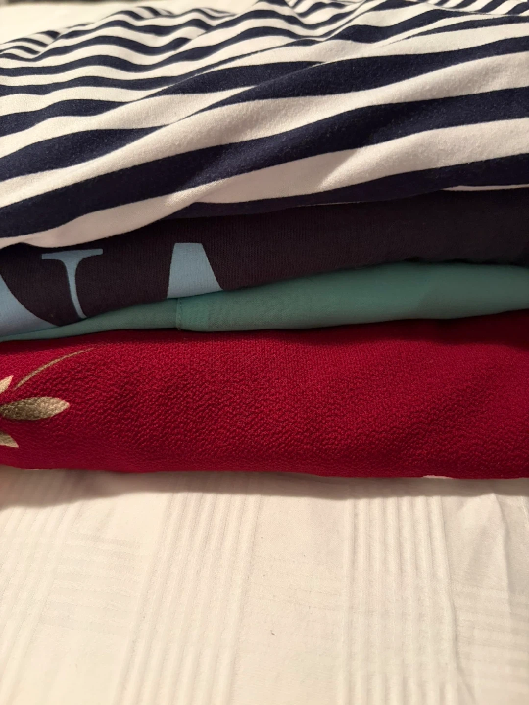 Includes navy and white striped lounge pants with drawstring , a dark blue top with a light blue graphic “Selena”, a mint sheer sleeveless green blouse with lace design on top back, and a burgundy flowy dress with a floral print.