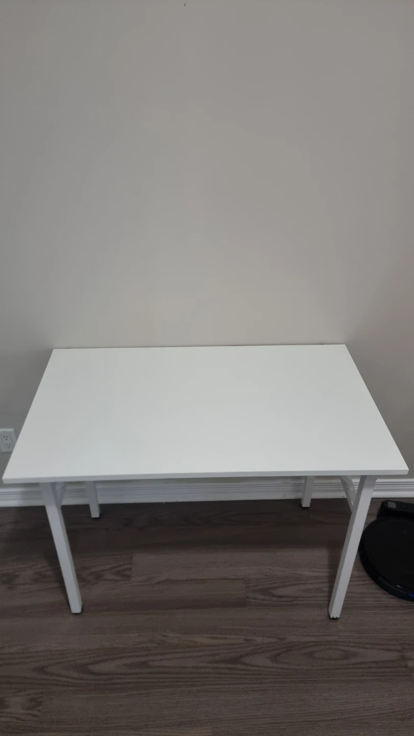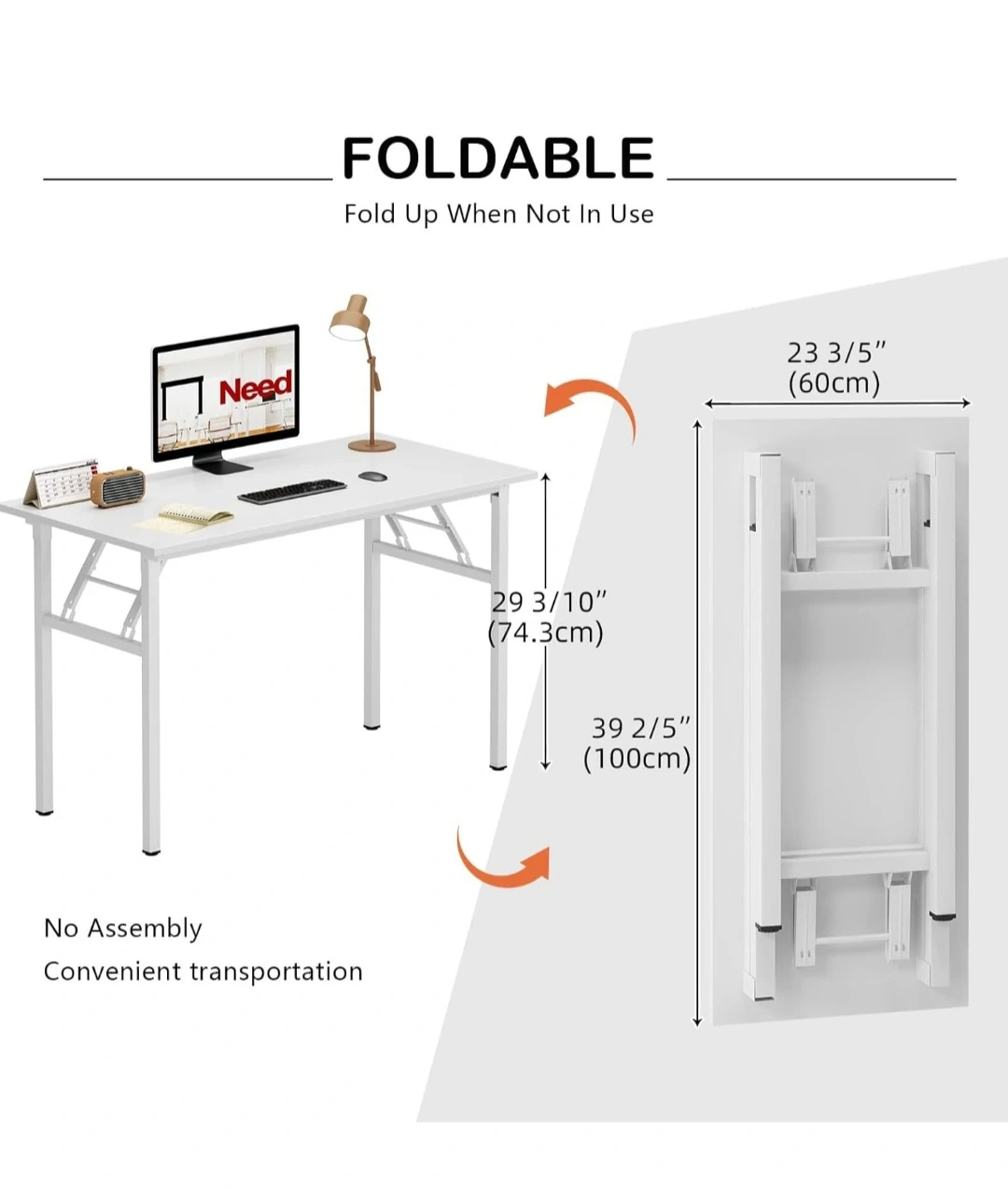 60Selling a foldable white desk! It's great because it folds up when not in use, making it easy to store and transport. No assembly is required. See last picture for dimensions.