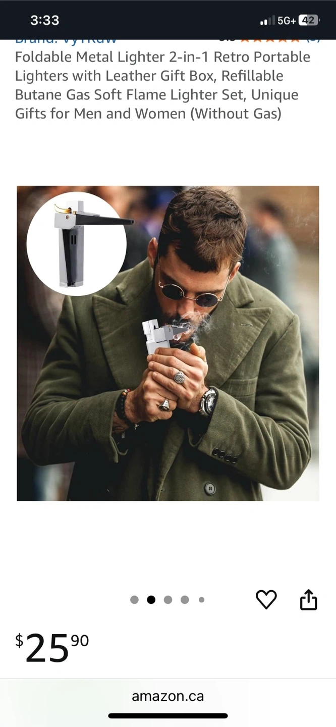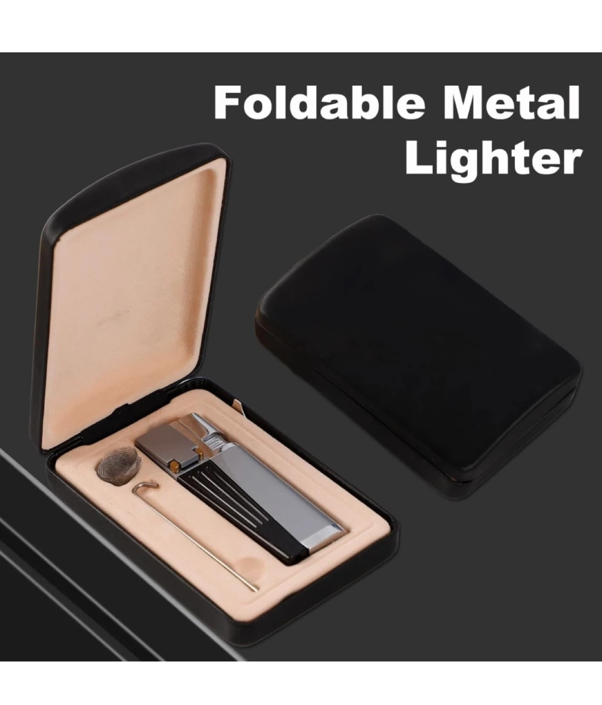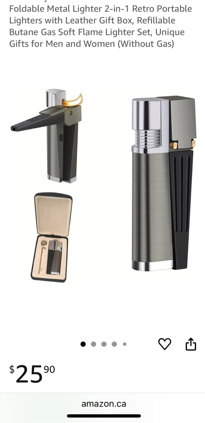 Selling a foldable metal lighter that's both retro and portable! It's a 2-in-1 design, so it can be used in multiple ways. It comes with a leather gift box, making it a great set. It's also refillable with butane gas and provides a soft flame. Originally bought for $25.90+ tax on Amazon. Makes an excellent Christmas gift or stocking stuffer!