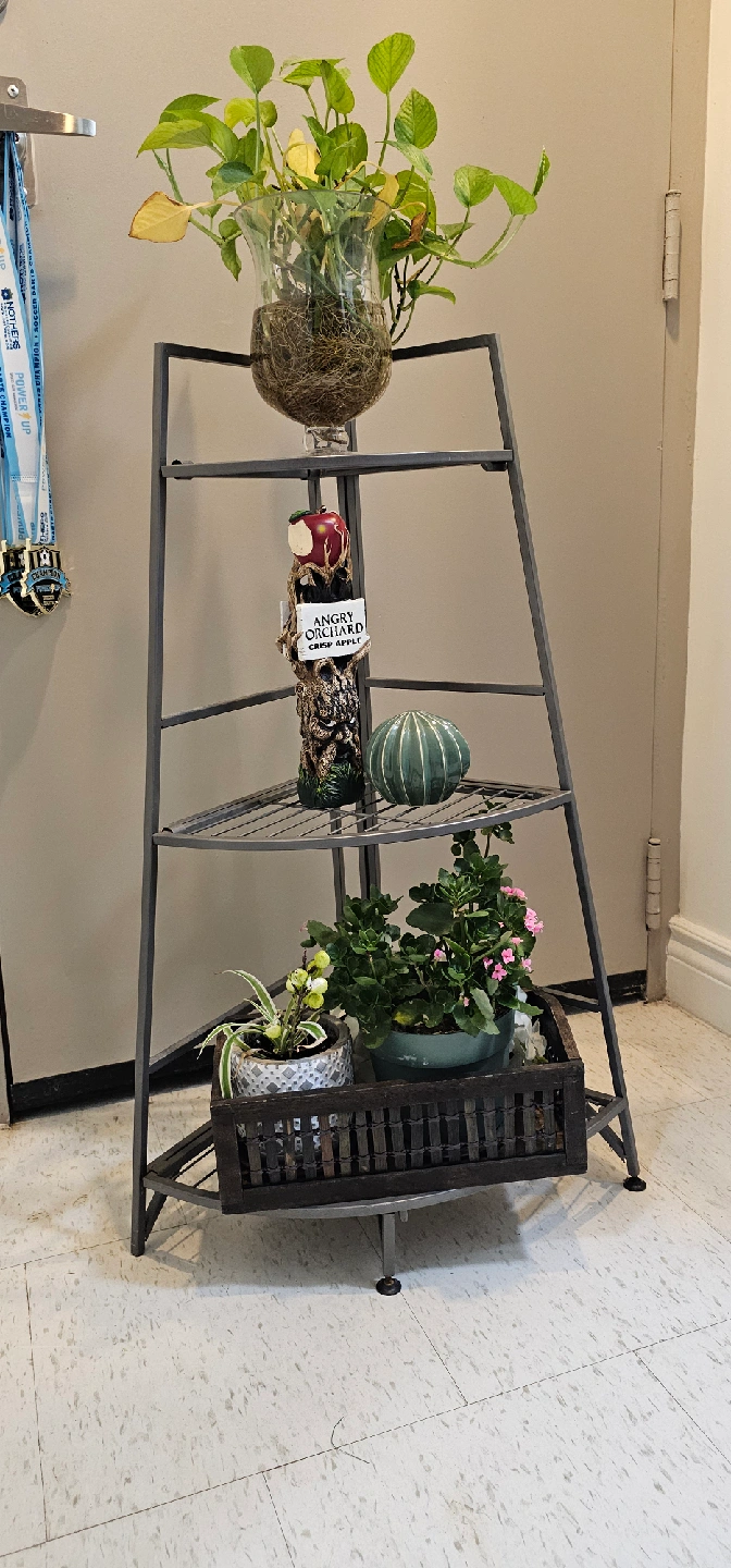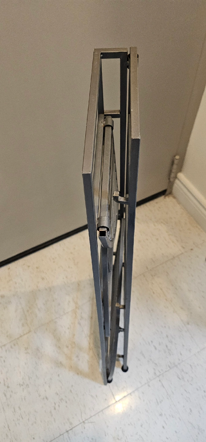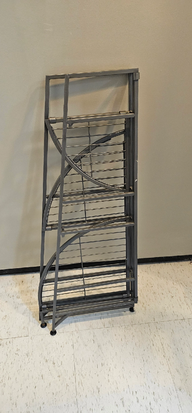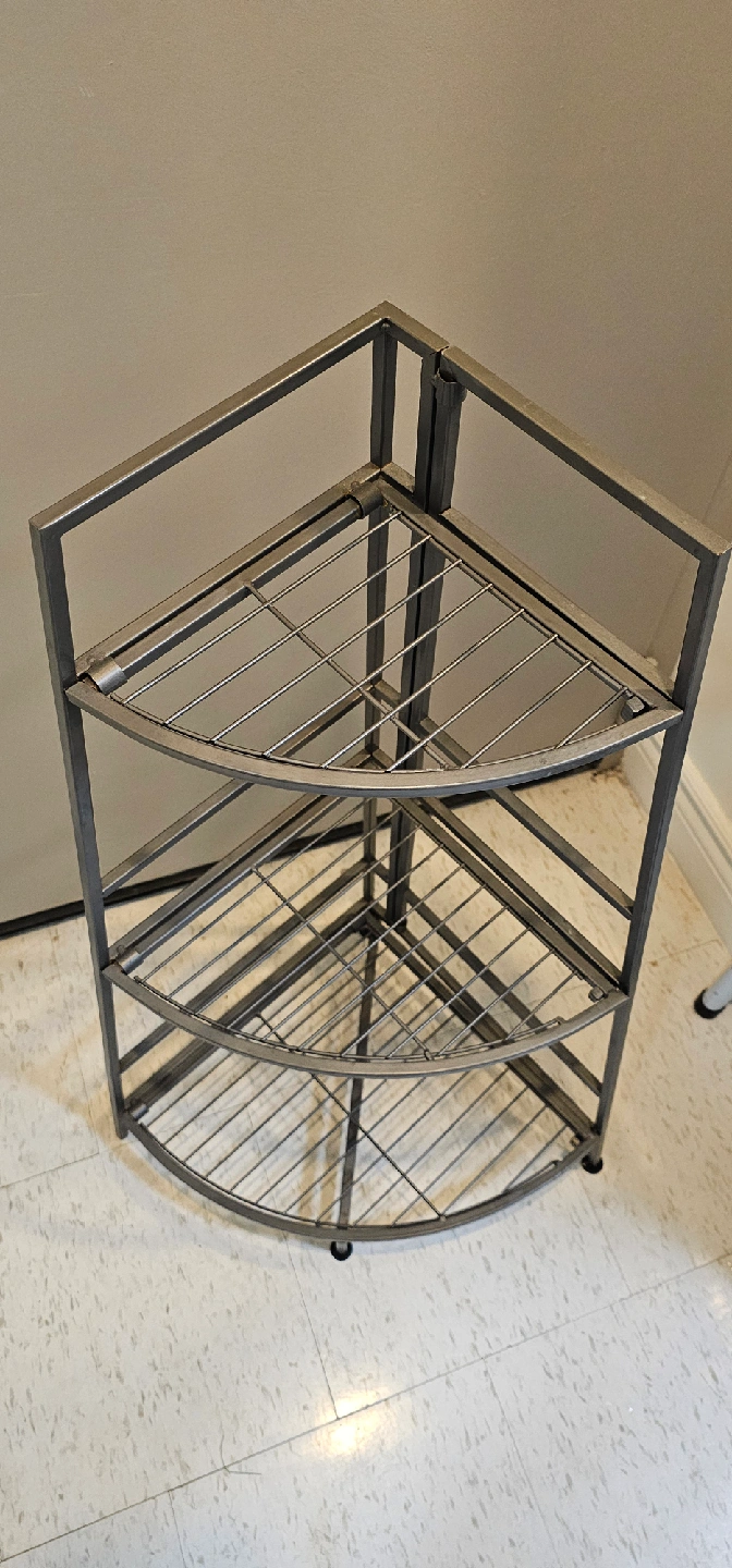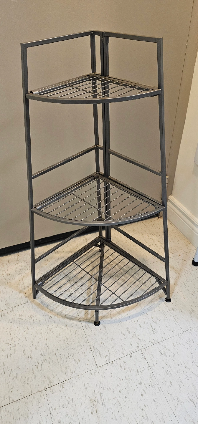 Selling a handy foldable corner shelf unit! It's a grey metal frame with three shelves, perfect for adding some extra storage in a small space. It's in great shape and folds up easily for storage or transport