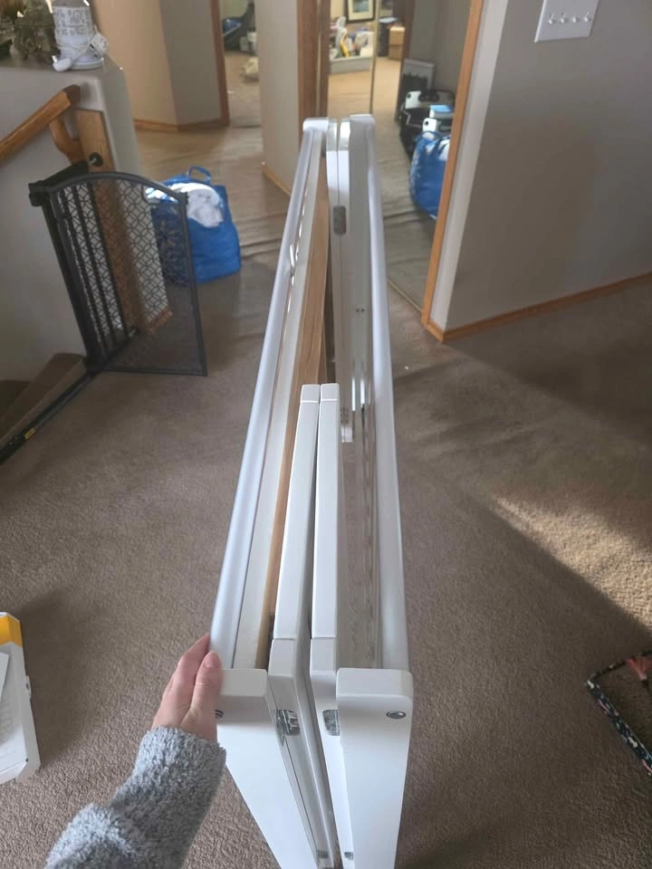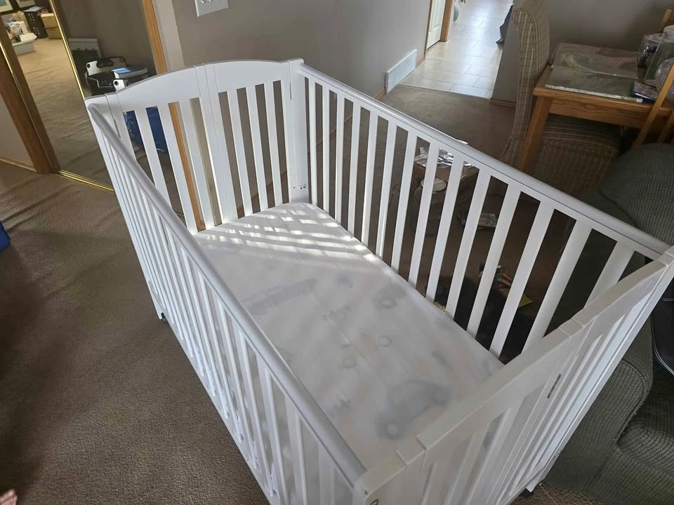 5Foldable standard crib on wheels that can lock w crib mattress. Mattress is like new, barely been used. Comes with white fitted sheet.