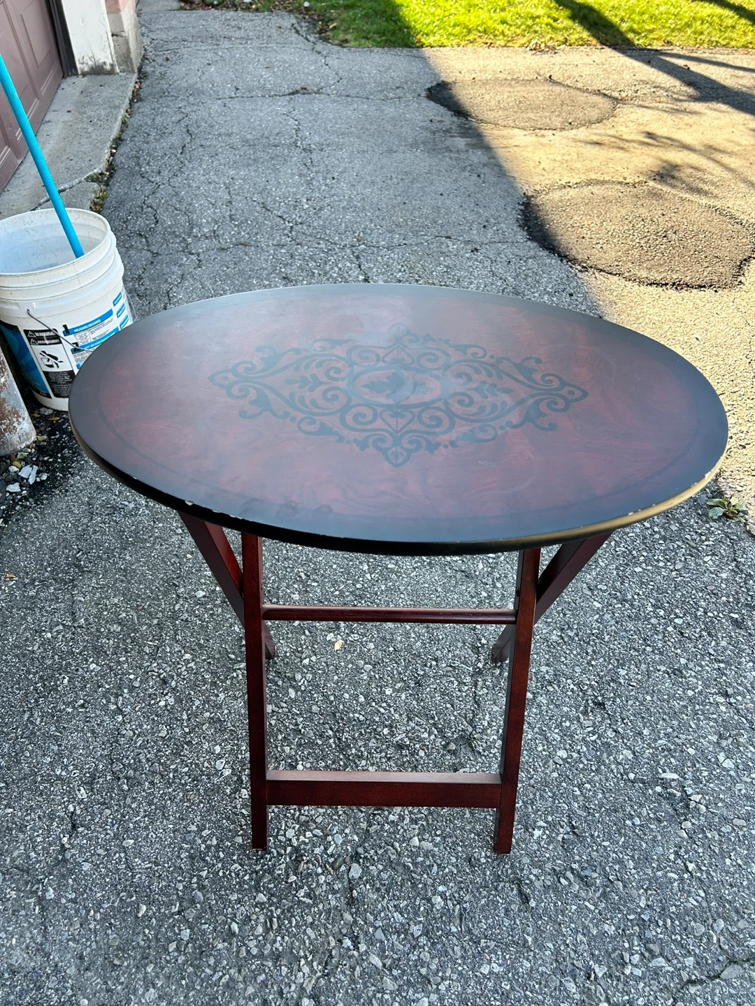 76Selling a lovely folding accent table! It's perfect for adding a touch of elegance to any room. The round shape and unique design on the top make it a standout piece. Easy to fold and store when not in use.