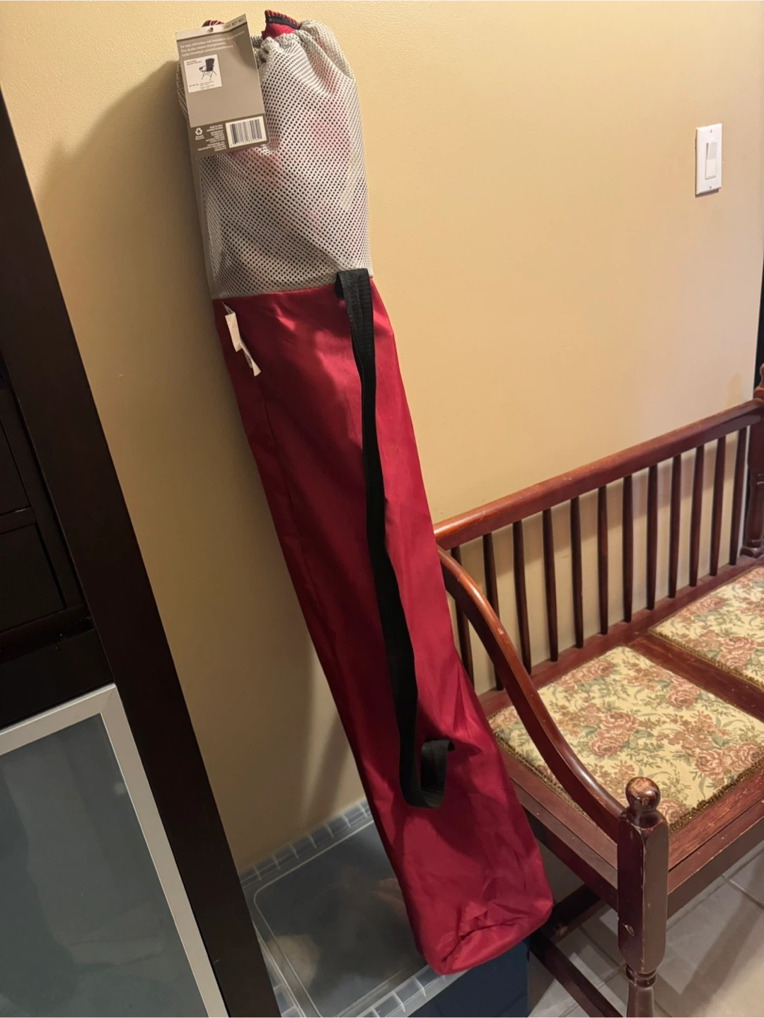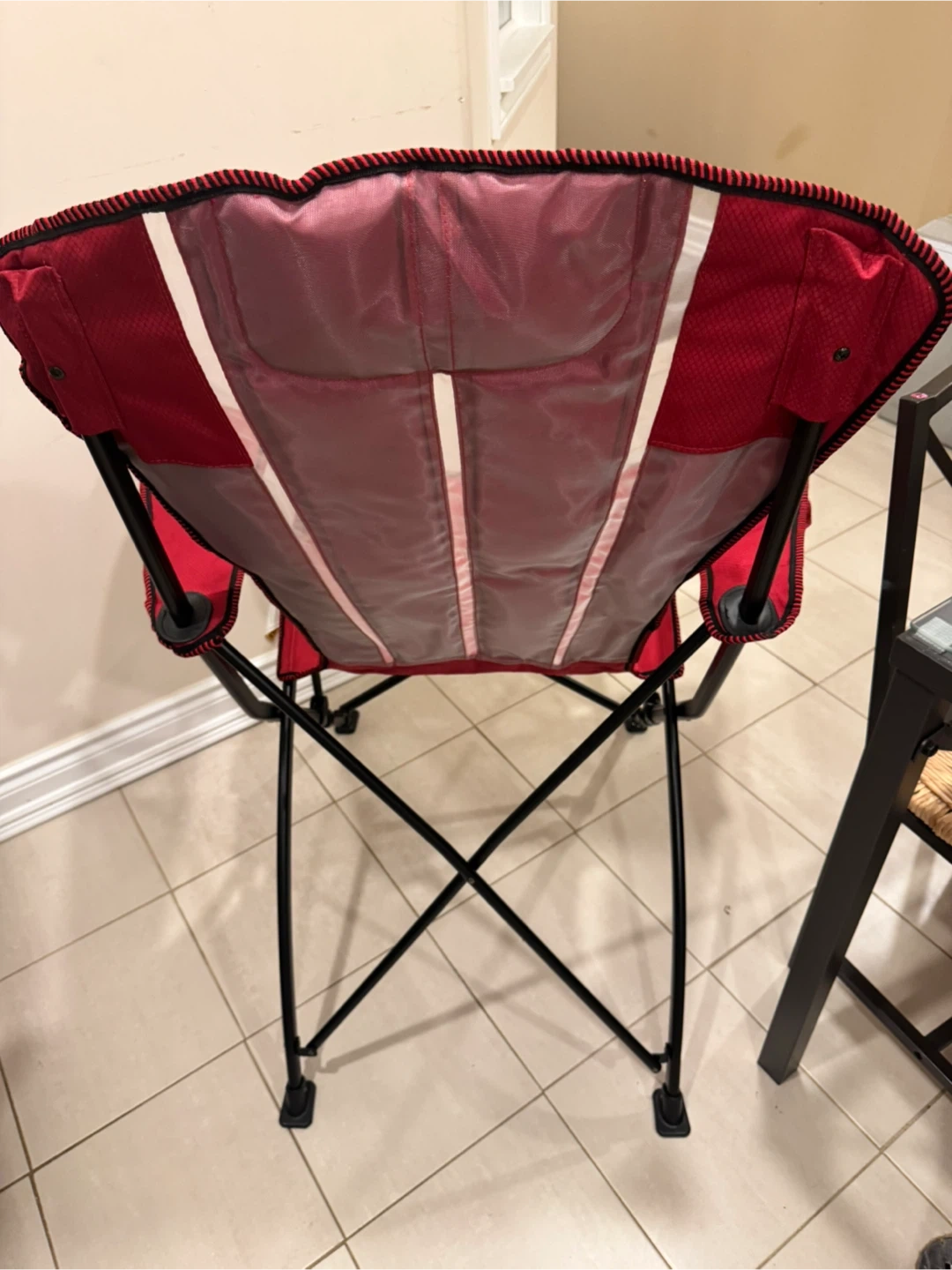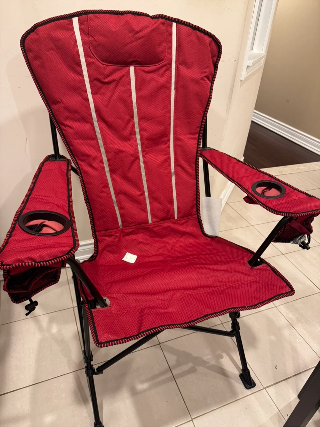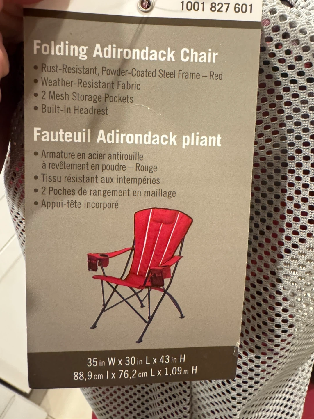 15This folding Adirondack chair is perfect for relaxing outdoors! It features a rust-resistant, powder-coated steel frame in red, and weather-resistant fabric. It also has two mesh storage pockets and a built-in headrest. The chair measures 35 inches wide x 30 inches long x 43 inches high.