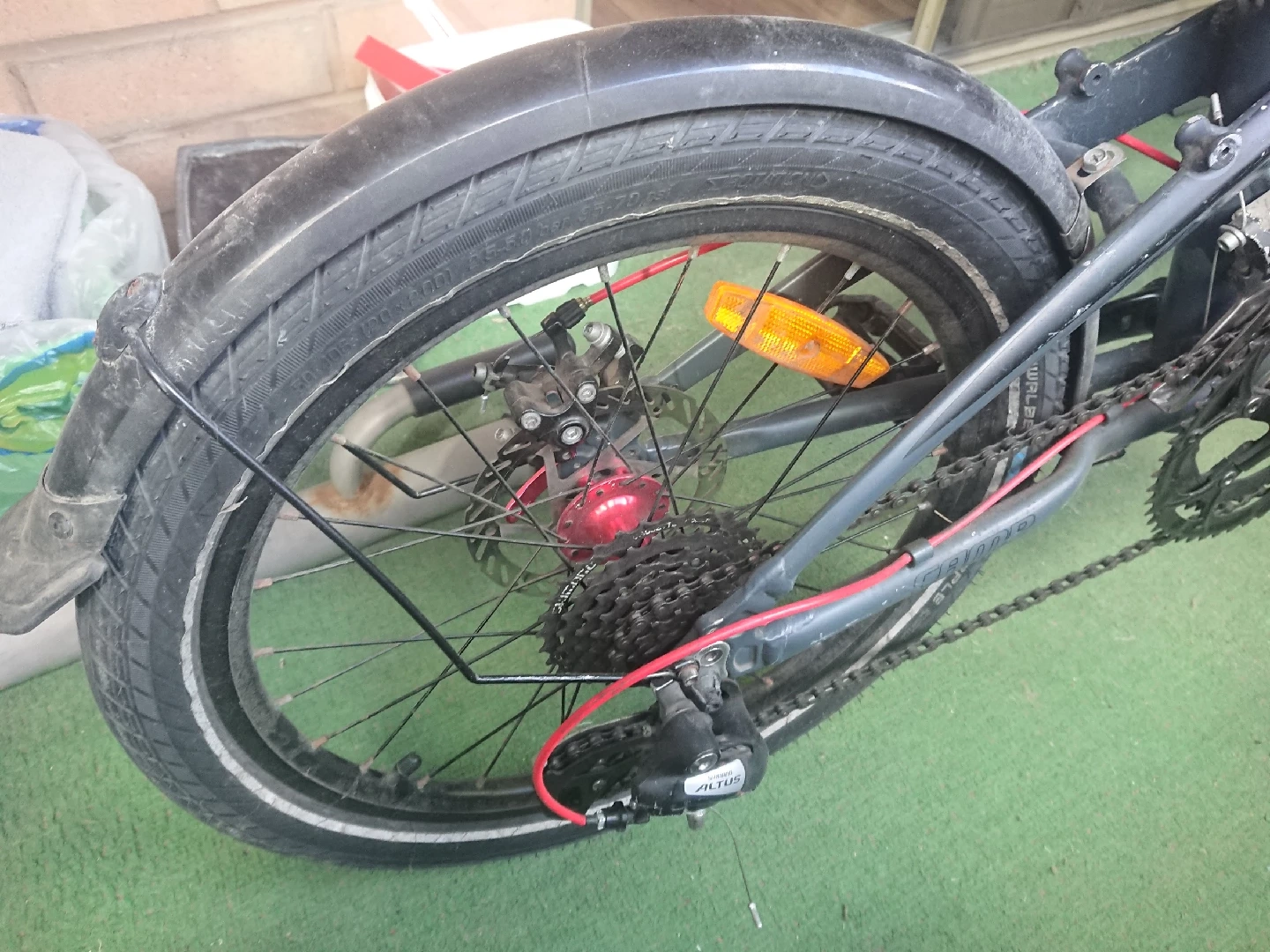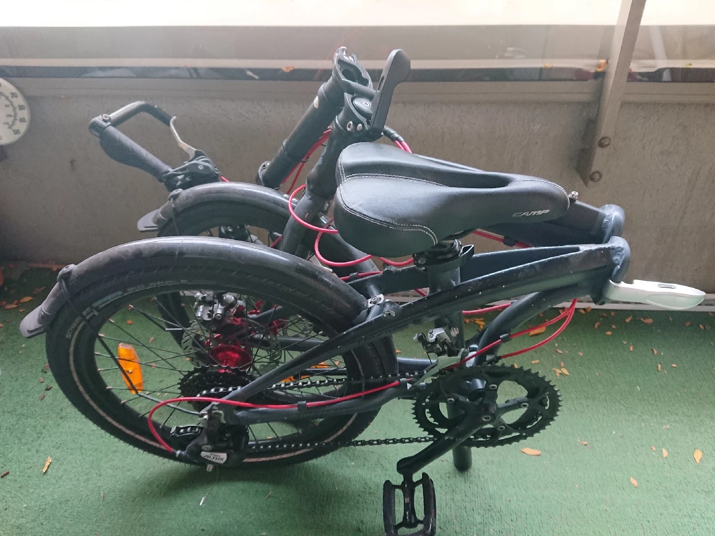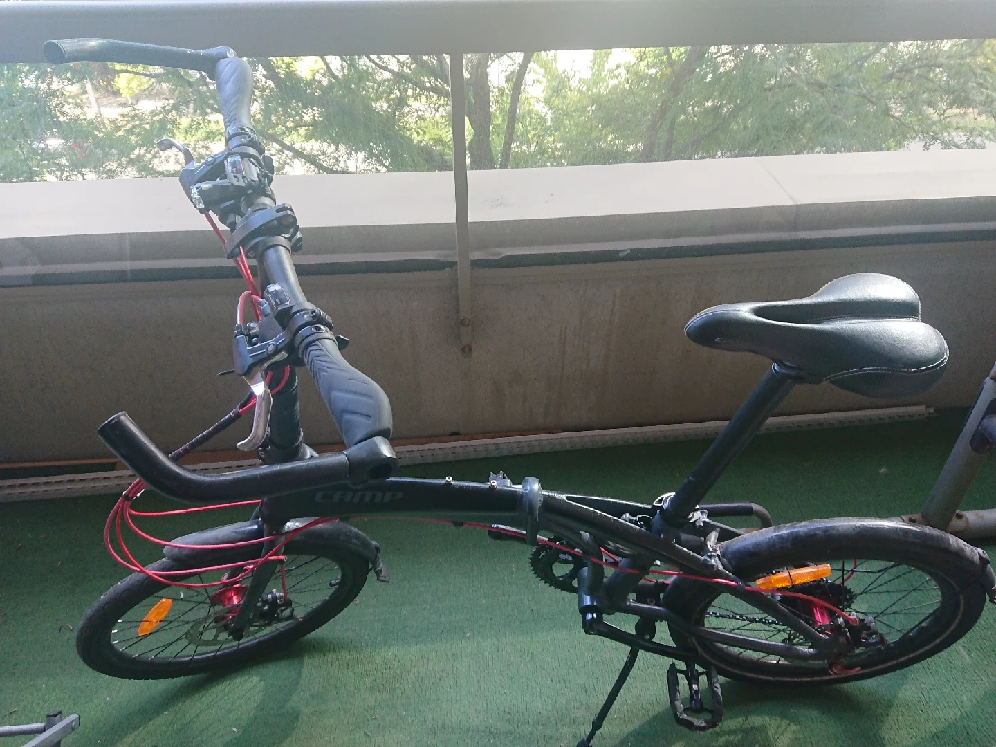 Selling a CAMP folding bike. St. steel frame, 20in wheels, disc brakes, 16-speed, 8 years old, one owner. Has scratches, brakes need tightening, one spoke broken in the rear wheel. Back wheel changed to Schwalbe big apple 20x2, front wheel 20x1.5. Mirror, led light.