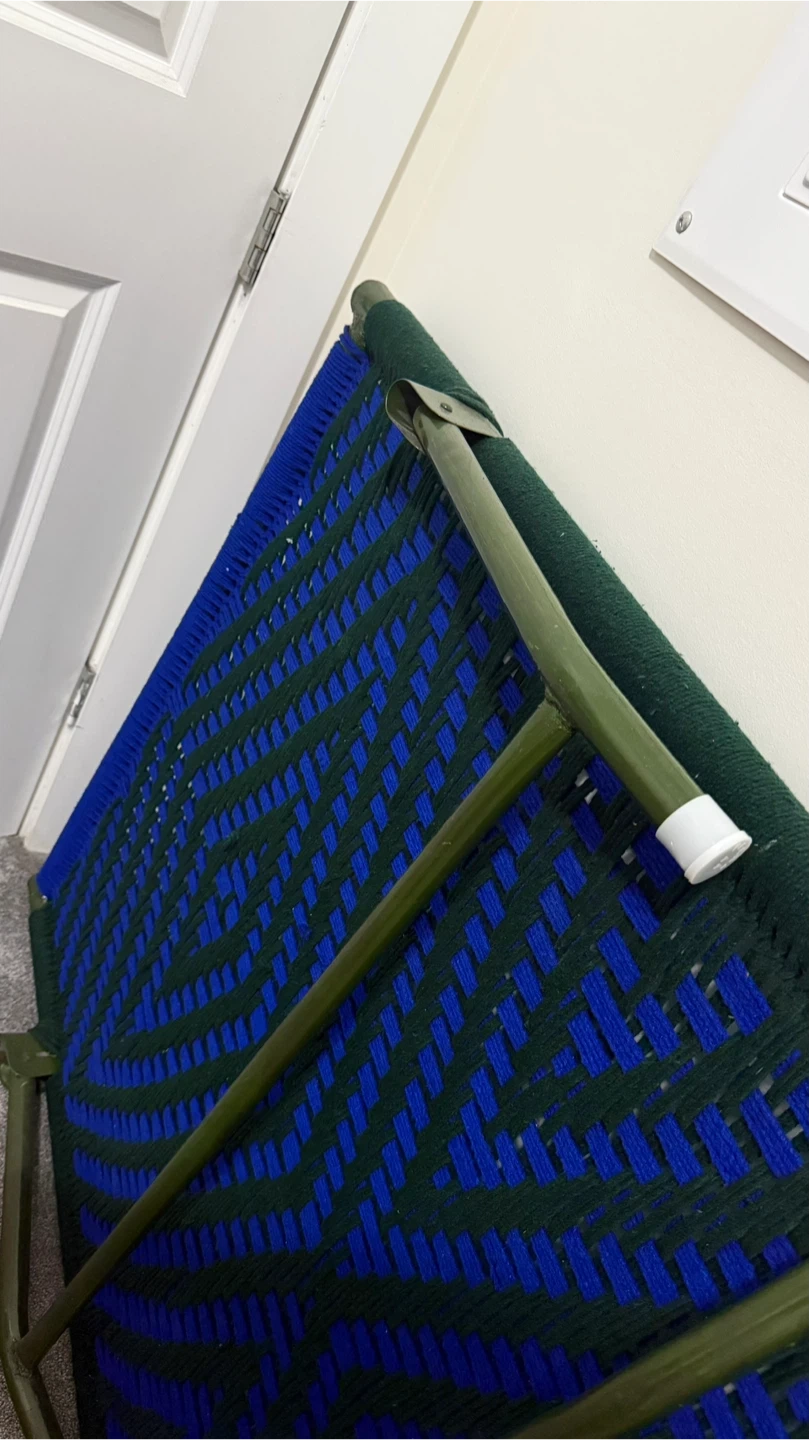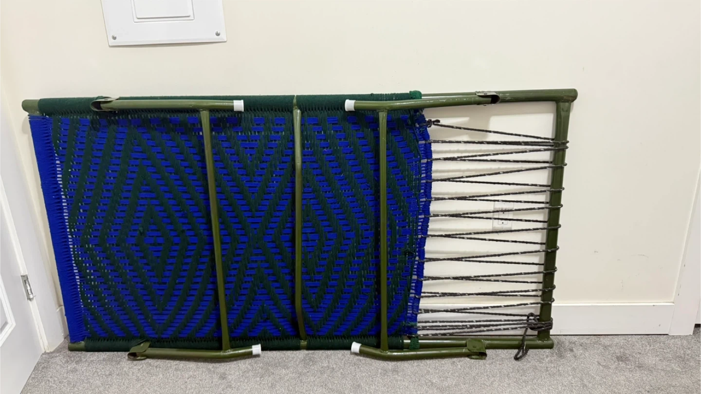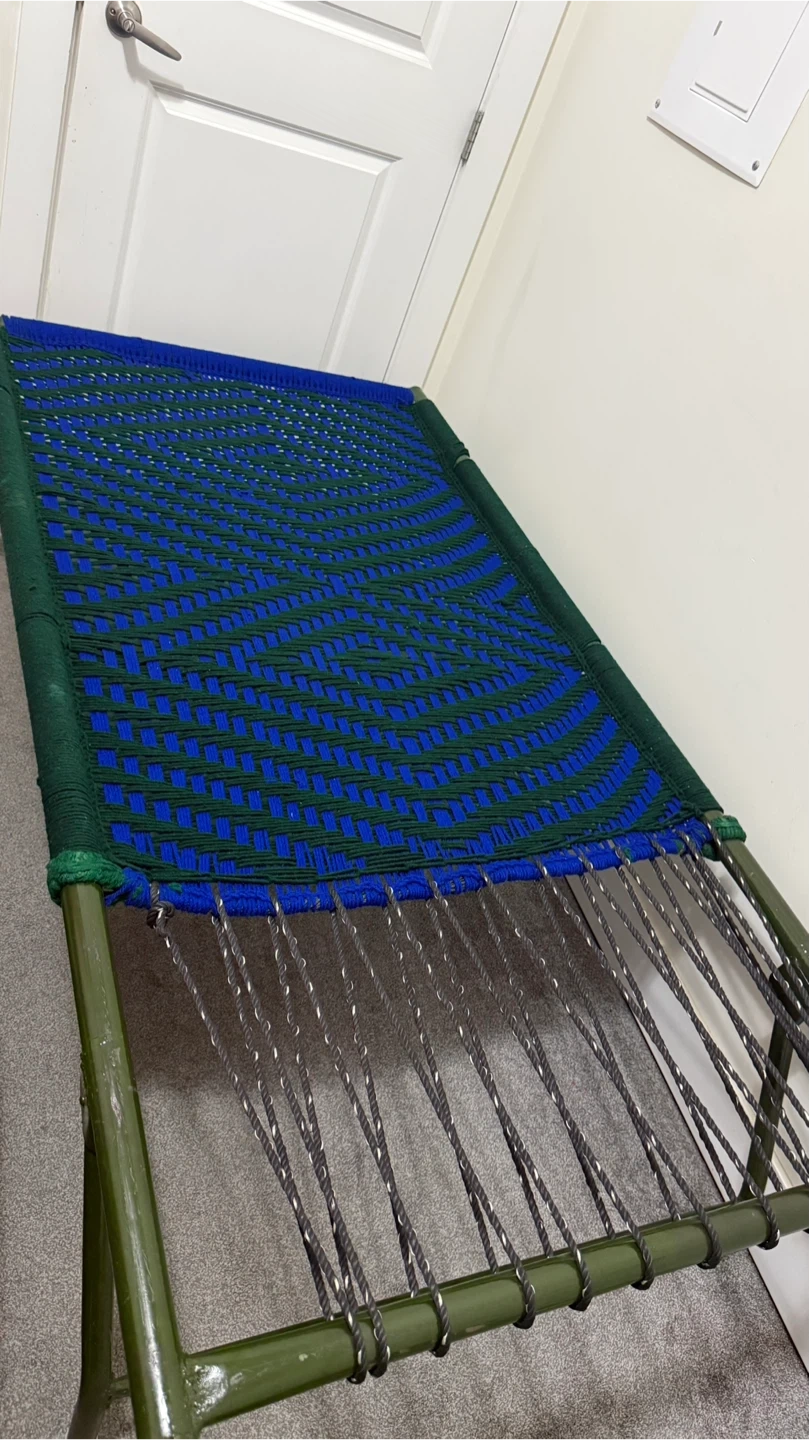 Selling a folding camp cot in good condition. It features a woven blue and green top, perfect for camping or as an extra bed for guests. Easy to fold and store when not in use. DAYBED