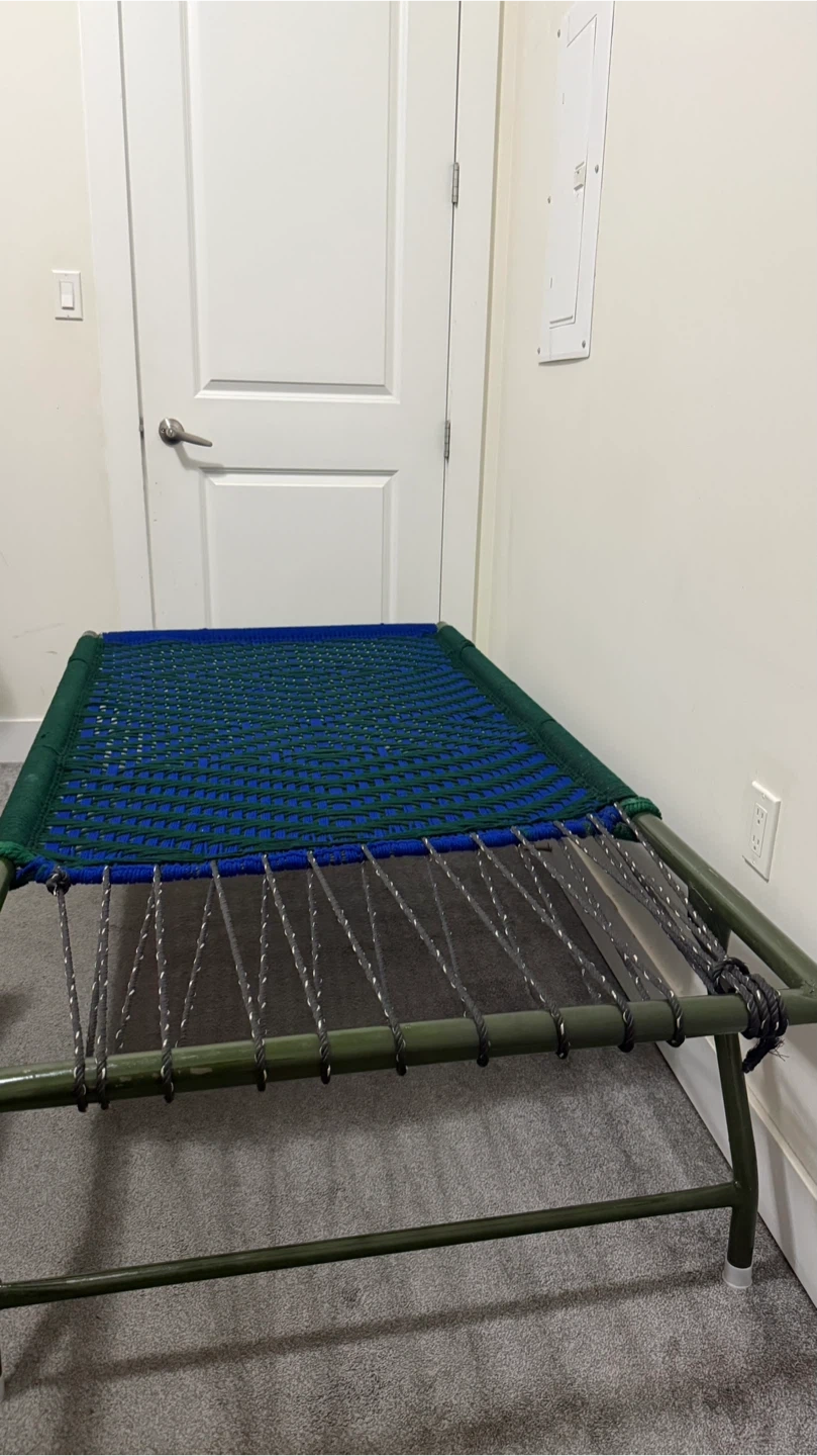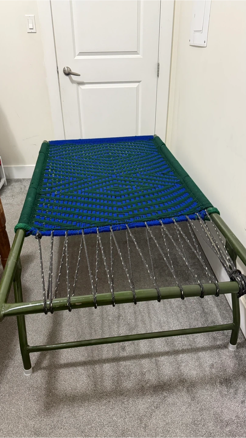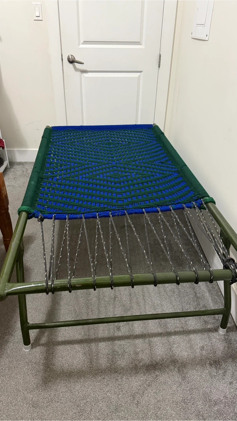 Selling a folding camp cot in good condition. It features a woven blue and green top, perfect for camping or as an extra bed for guests. Easy to fold and store when not in use. DAYBED