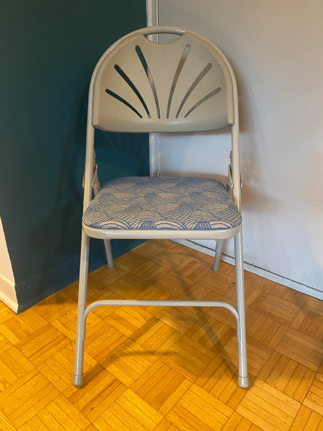 Comfortable folding chair, padded seat with a wavy blue and beige pattern. Perfect for extra seating when you have unexpected guests over and/or for small spaces where you need a chair that can be easily stored away when not in use. In excelente condition.