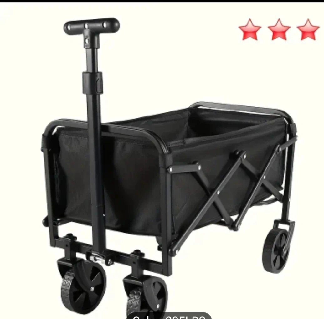 222This heavy duty folding wagon cart is ready for your next adventure! It's black and looks to be in good condition. Can handle a load of up to 180lbs, perfect for carrying groceries, camping gear, or anything else you need to haul around. Gently used