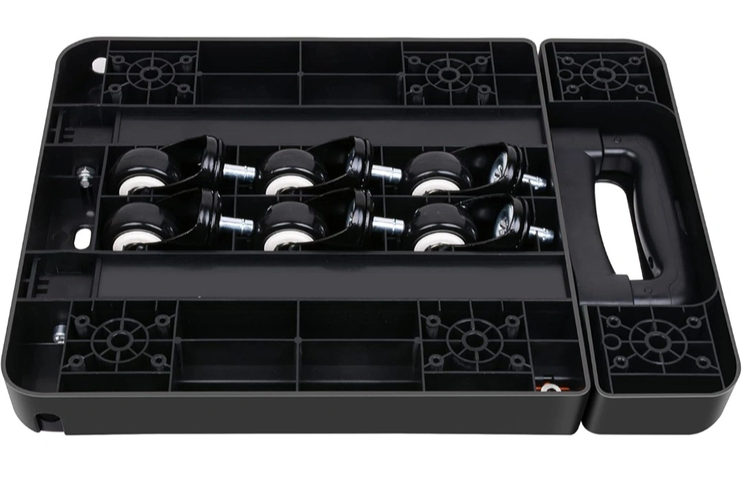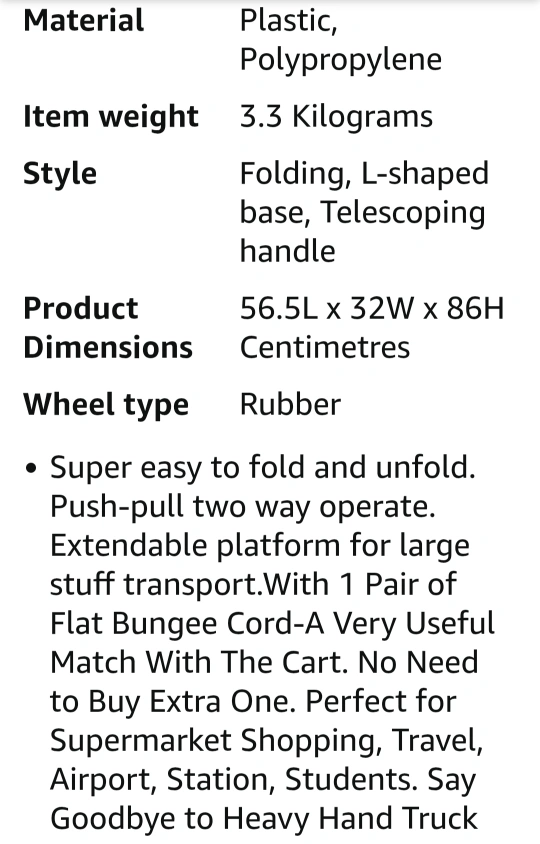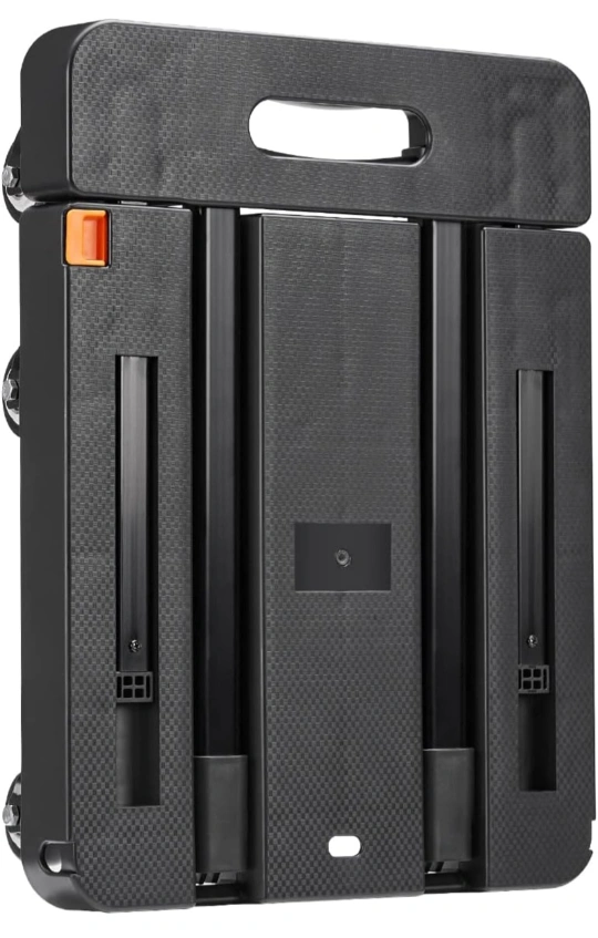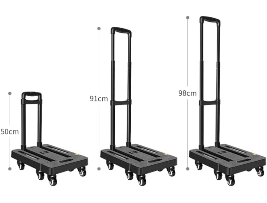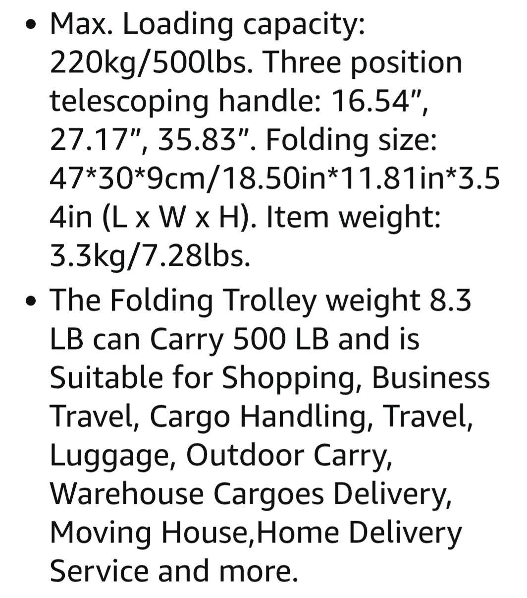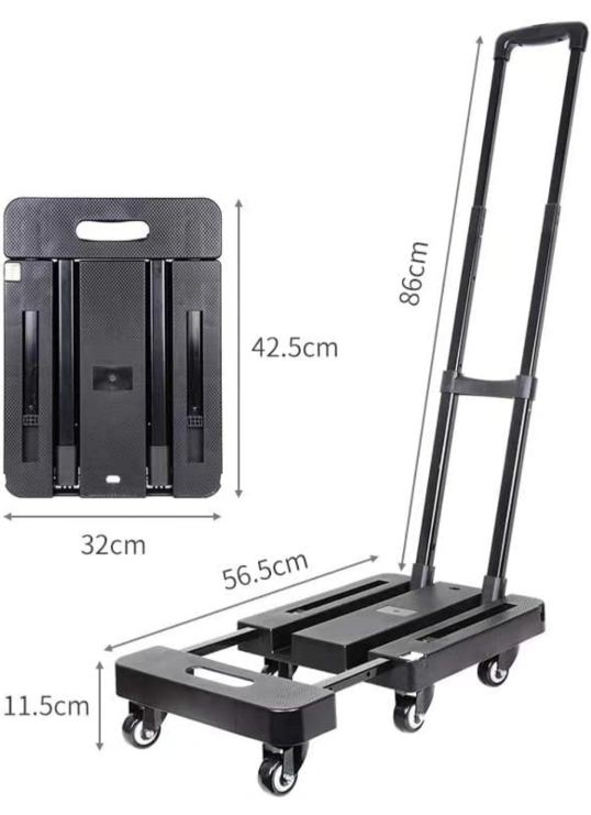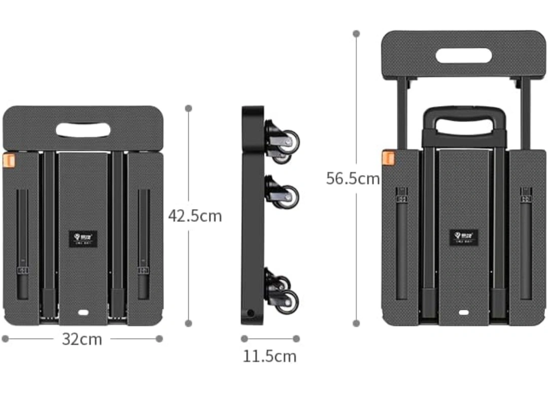 FOLDING COMPACT HAND CART. Light Weight, with a 500 lbs carrying capacity. It features a 360° rotating wheel folding trolley. Great for luggage, travel, shopping, auto, moving, and office use. Dimensions when folded are approximately 42.5cm x 32cm x 11.5cm. When unfolded, the height ranges from 50cm to 98cm