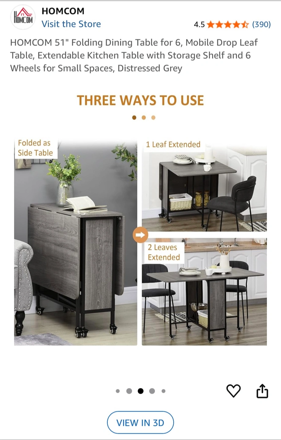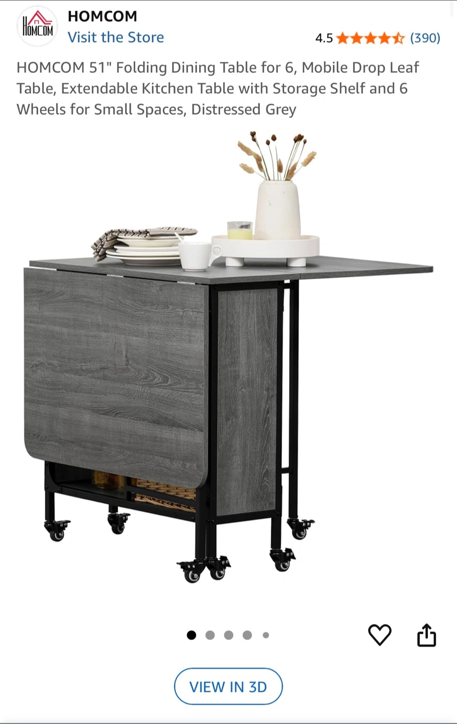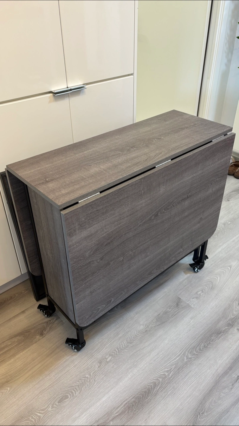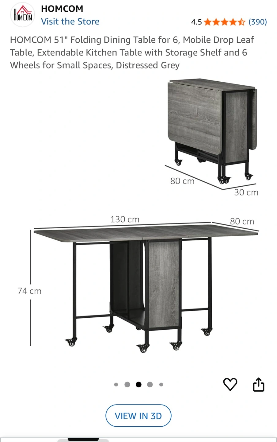 97Selling a HOMCOM 51" folding dining table in a distressed grey finish. It's perfect for small spaces and offers three ways to use it: folded as a side table, with one leaf extended, or with two leaves extended. Key features: - Mobile drop leaf table - Extendable kitchen table with storage shelf - Six wheels for easy movement Dimensions: - 130 cm (length when fully extended) - 80 cm (width) - 74 cm (height)