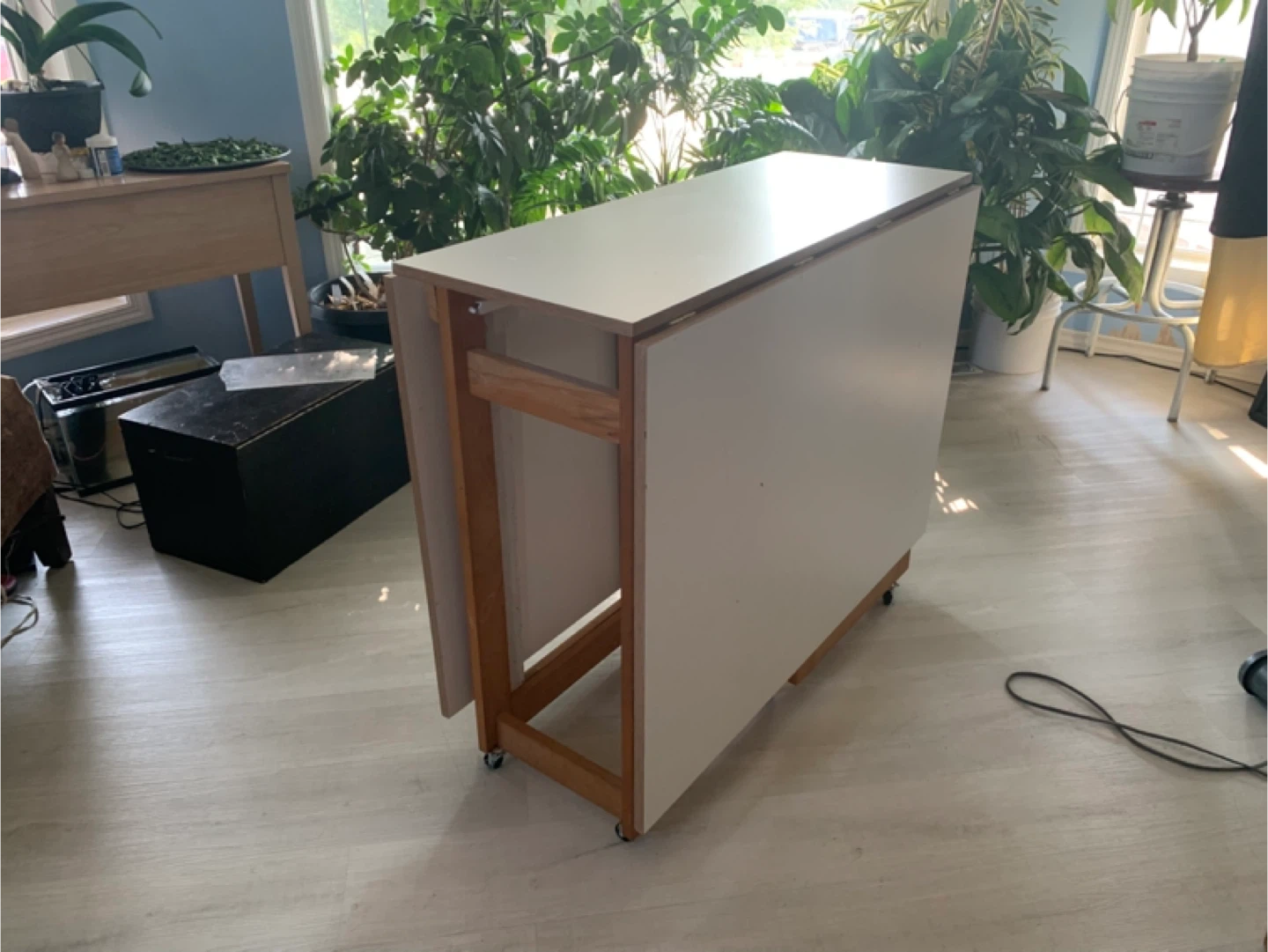 Selling a folding drop leaf table! It's perfect for small spaces and can be easily stored when not in use. The table features a white top and a wooden frame with wheels for easy mobility. It's in great condition and ready for a new home! Price Negotiable those interested