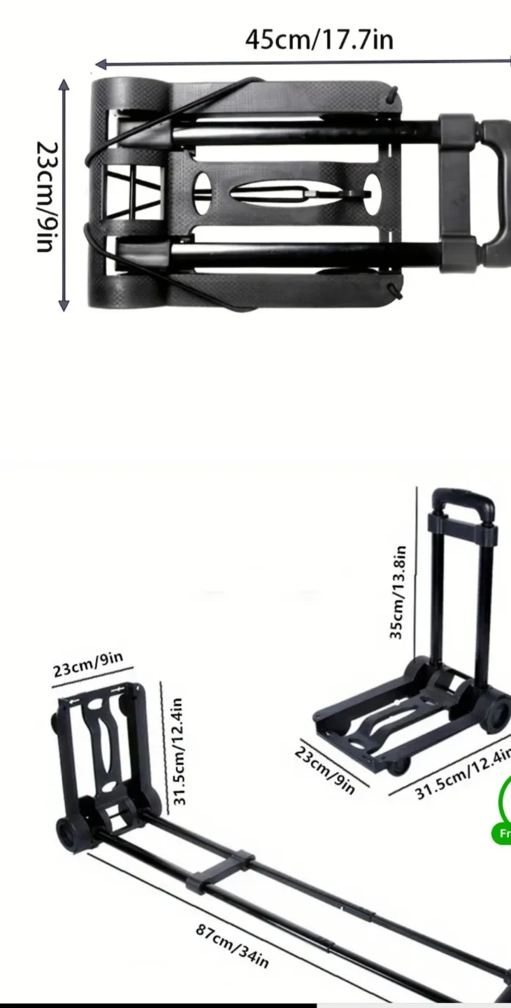 Selling a handy folding luggage cart! It's black and in great shape. When folded, it's about 23cm/9in x 45cm/17.7in. When fully extended, it measures about 87cm/34in in length. Perfect for travel or moving items around