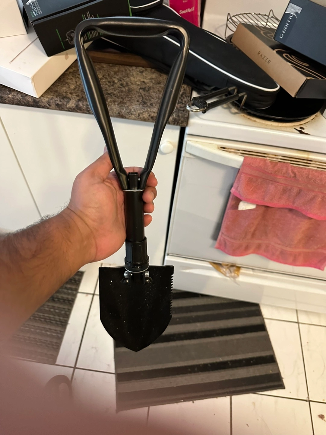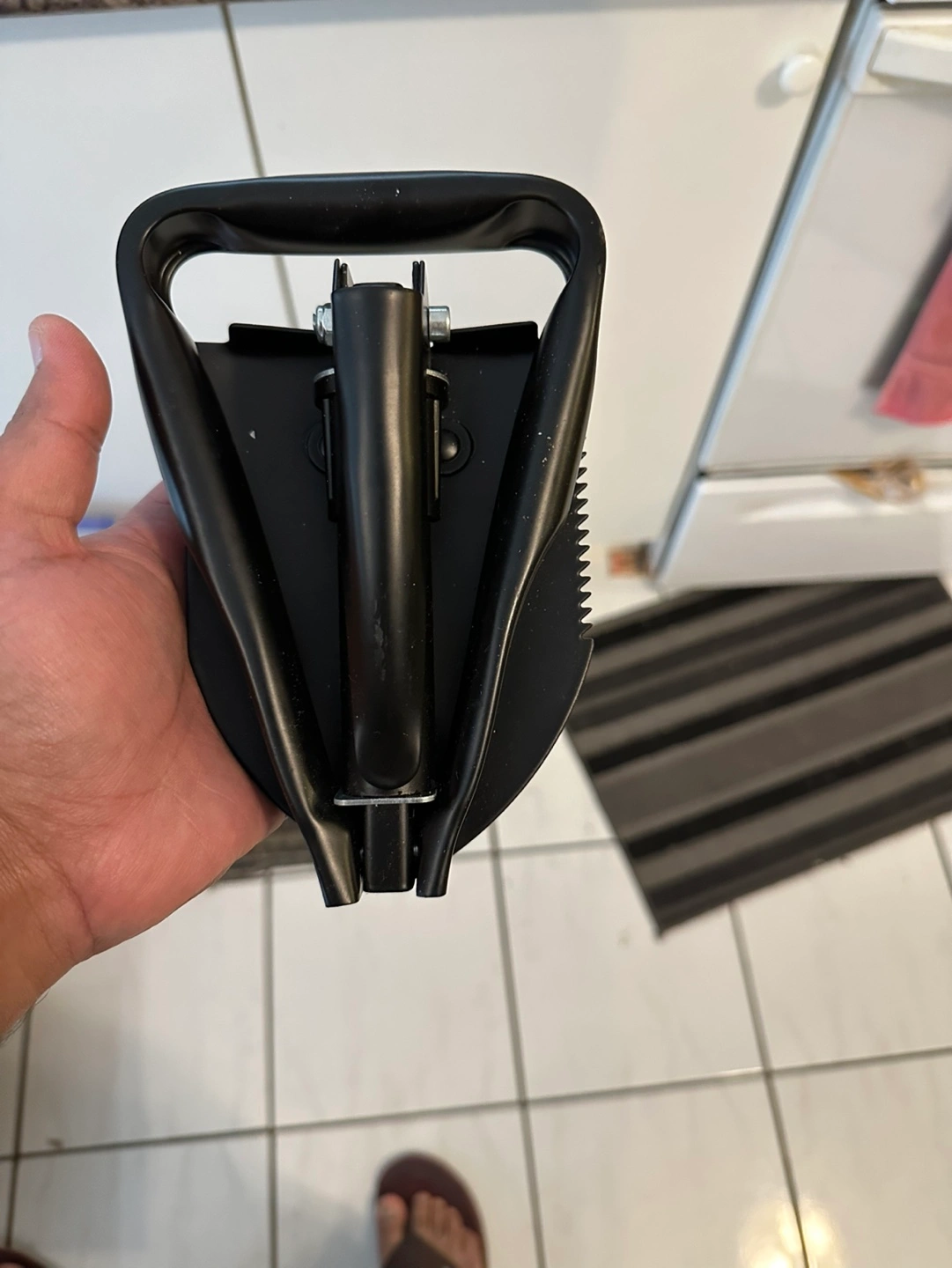 33Black folding shovel. Perfect for camping, gardening, or emergency preparedness.