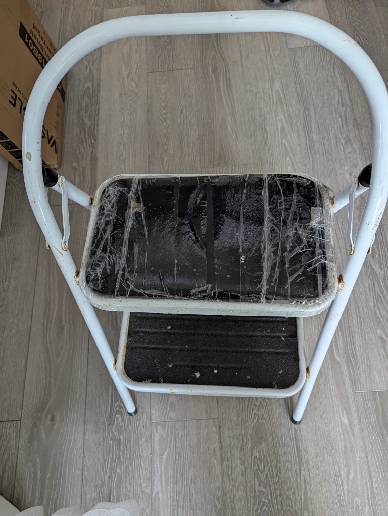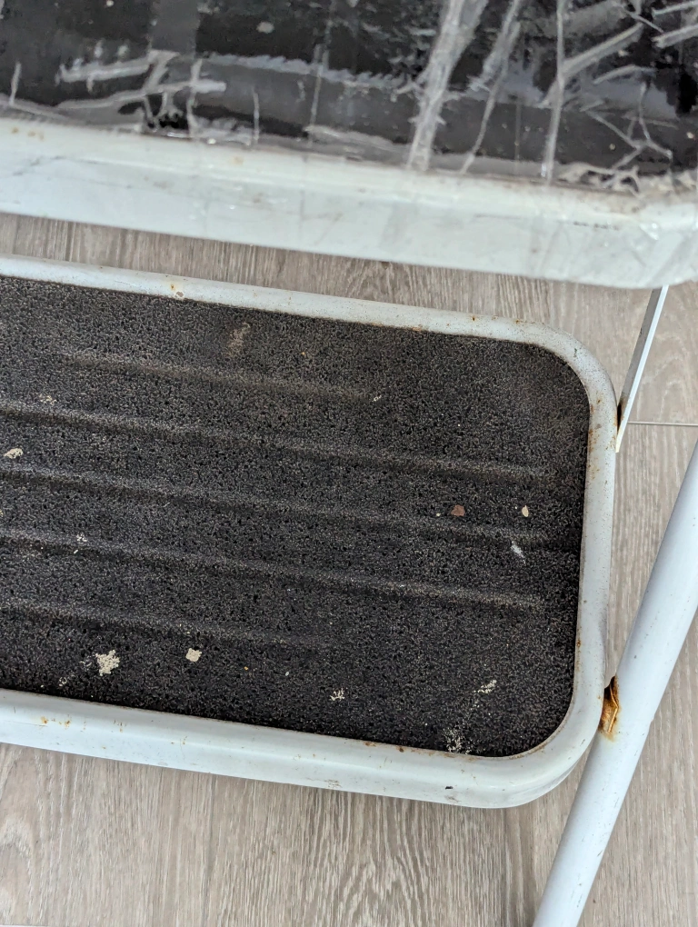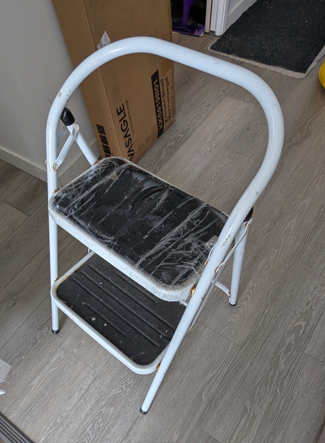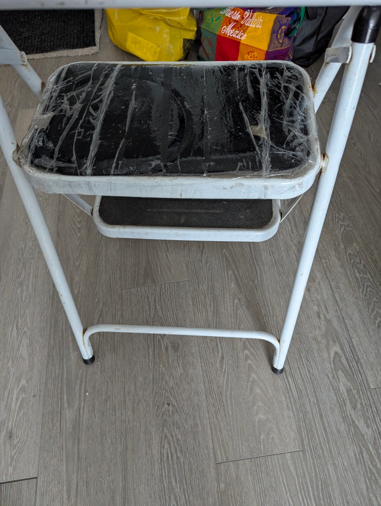 Selling a folding step stool with a white frame and black steps. It's perfect for reaching those high shelves in the kitchen or garage. It's in used condition, with some signs of wear, but still sturdy and functional. Great for small spaces, as it folds away easily for storage
