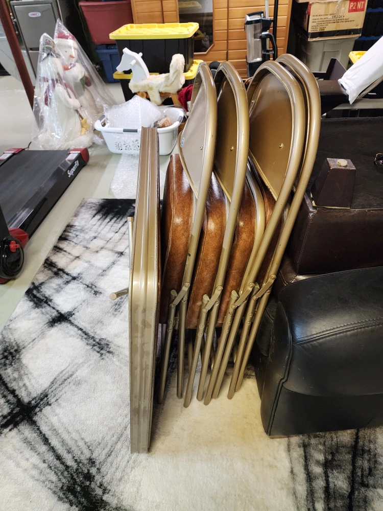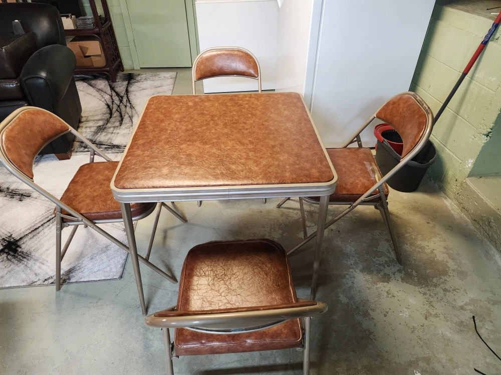 10Selling a folding table and chairs set. It's in good condition and perfect for small spaces or occasional use. The chairs are a warm brown colour with a metal frame. The table is a matching brown colour. Great for game night or extra seating during the holidays!