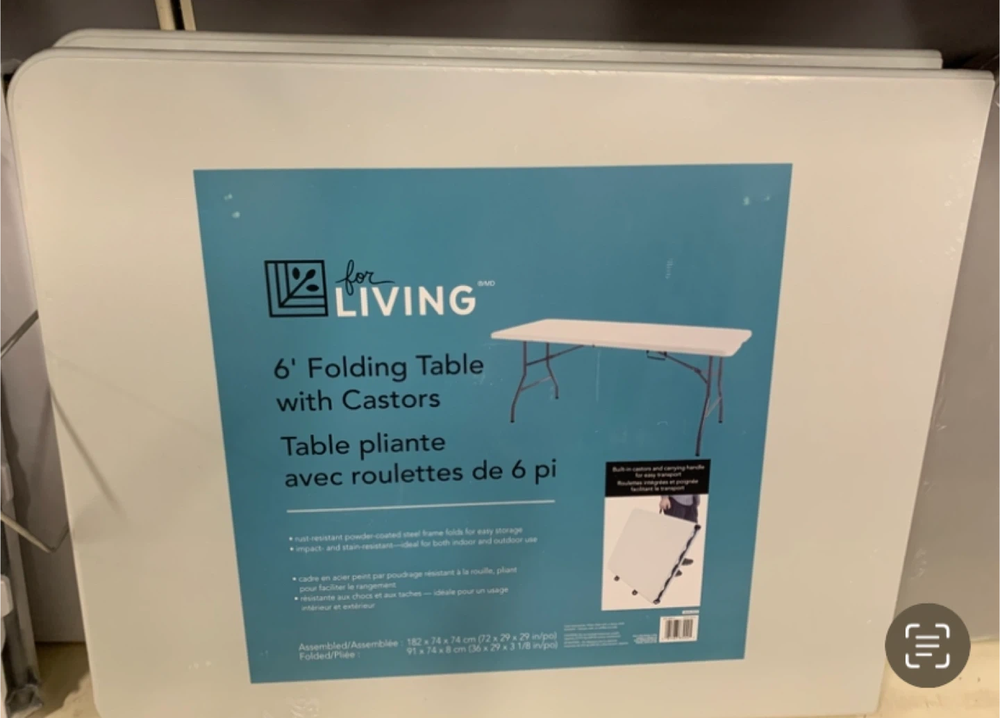 Selling a For Living 6' folding table with castors! It's a super handy table, great for both indoor and outdoor use. It's rust-resistant and stain-resistant, so it's easy to keep clean. When you're done, it folds easily for storage. The assembled dimensions are 182 x 74 x 74 cm (72 x 29 x 29 in) and when folded it's 91 x 74 x 8 cm (36 x 29 x 3 1/8 in)