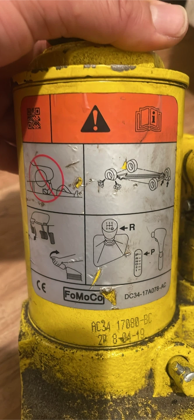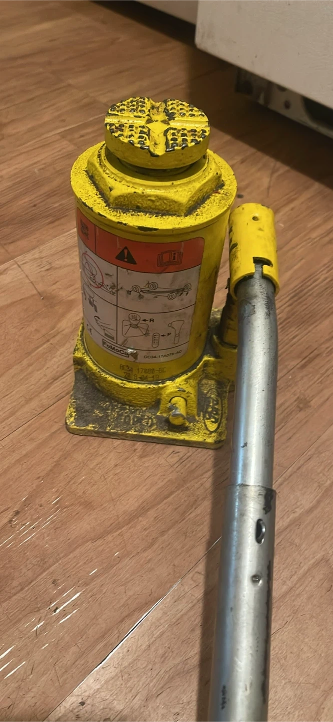 Selling a FoMoCo hydraulic bottle jack. It's yellow and shows some signs of use, but it's still functional. Has a capacity for lifting vehicles. Please refer to the images for details and condition