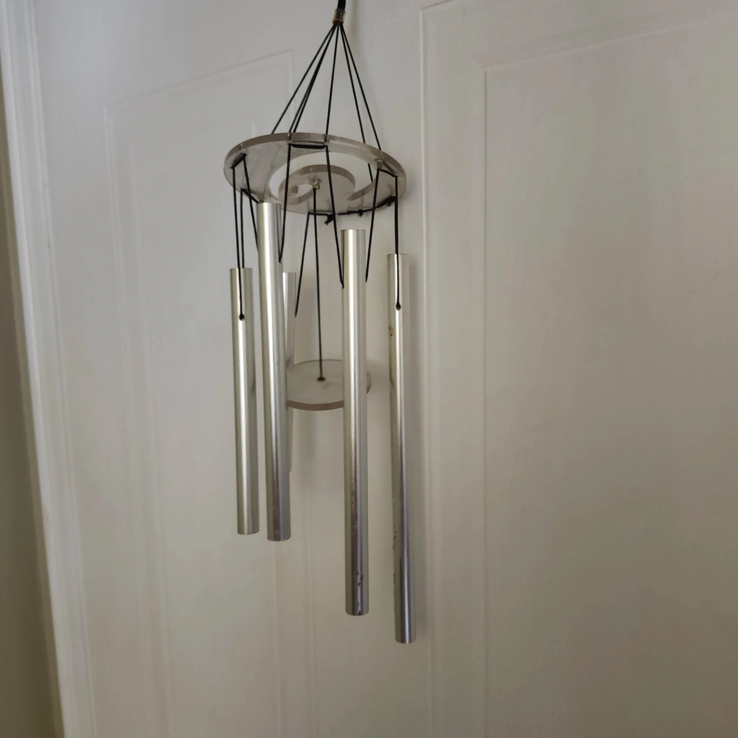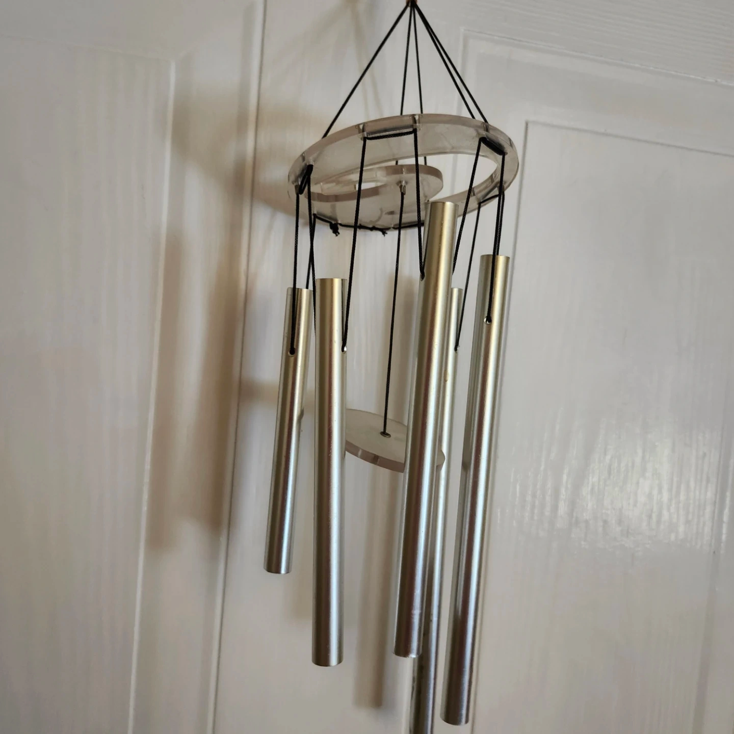 Selling a set of silver wind chimes. They're in great condition and make a lovely sound in the breeze. Perfect for adding a touch of zen to your porch or garden!