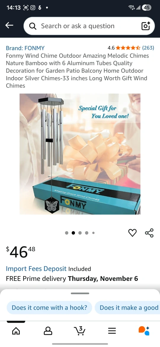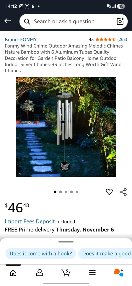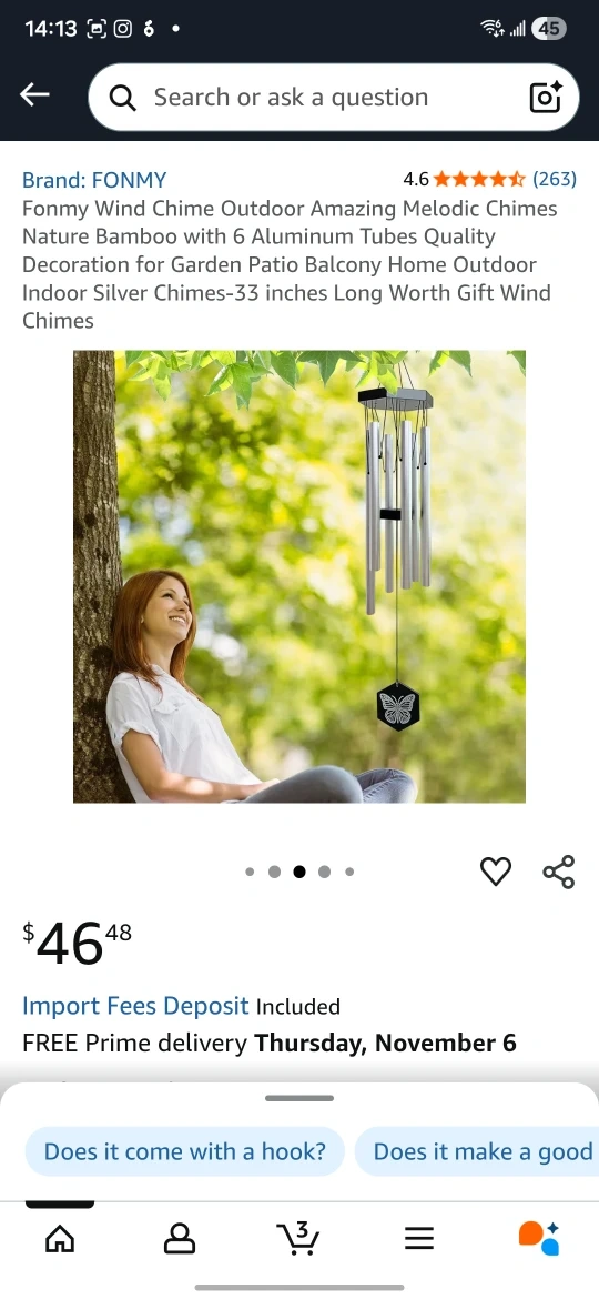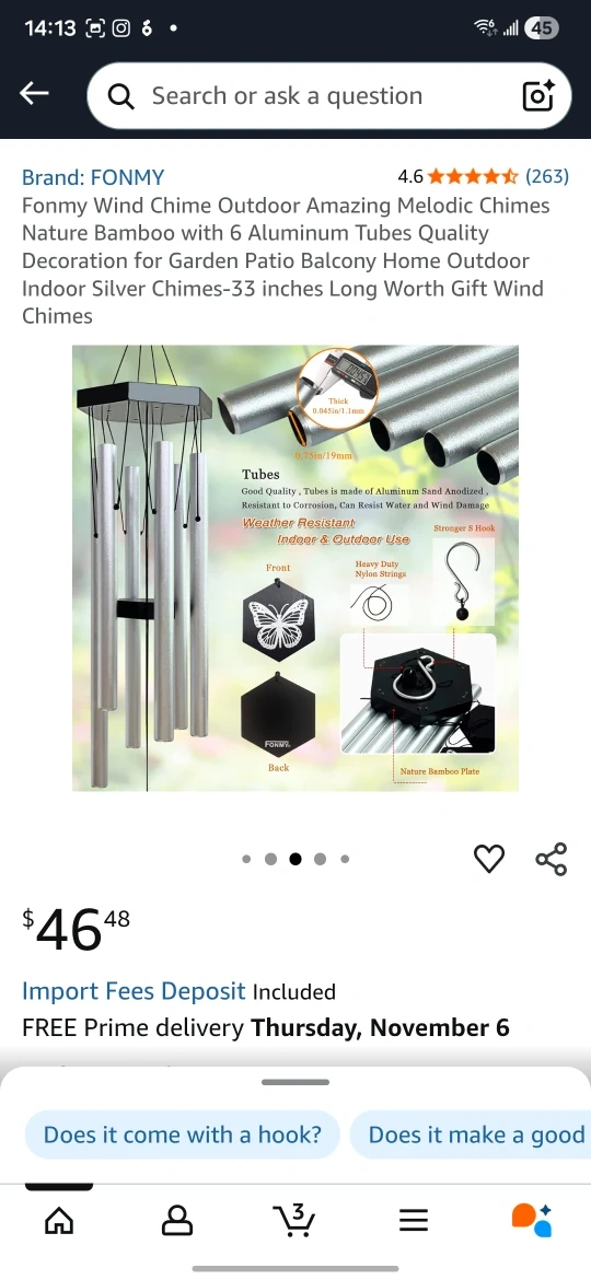 167Selling a Fonmy Wind Chime with 6 aluminum tubes. It's a quality decoration for your garden, patio, or balcony. The chimes are silver and 33 inches long. Good quality tube is made of Aluminum Sand Anodized, Rustproof, Corrosion and Resist Water and Wind Damage. Originally bought for $46.48