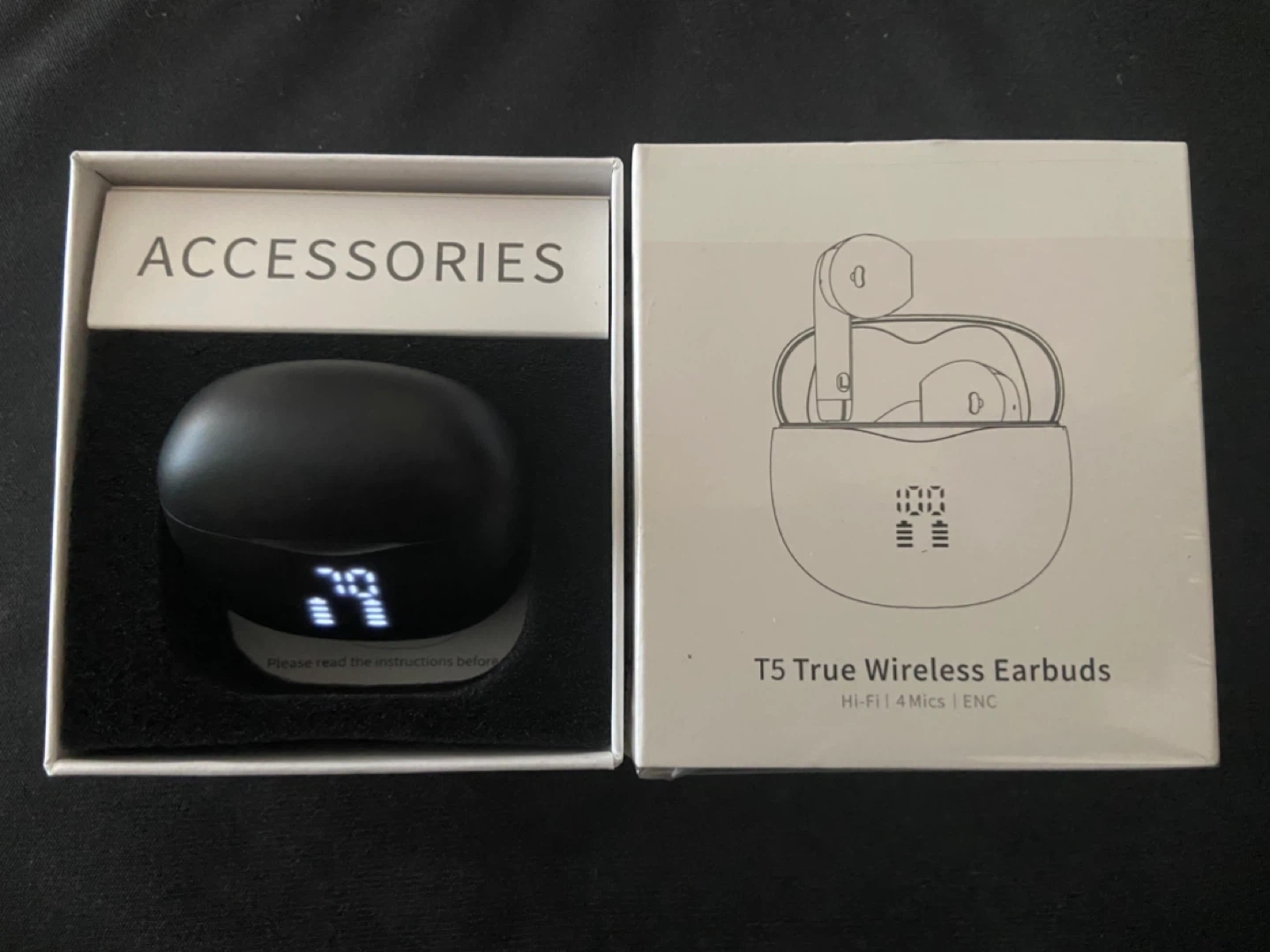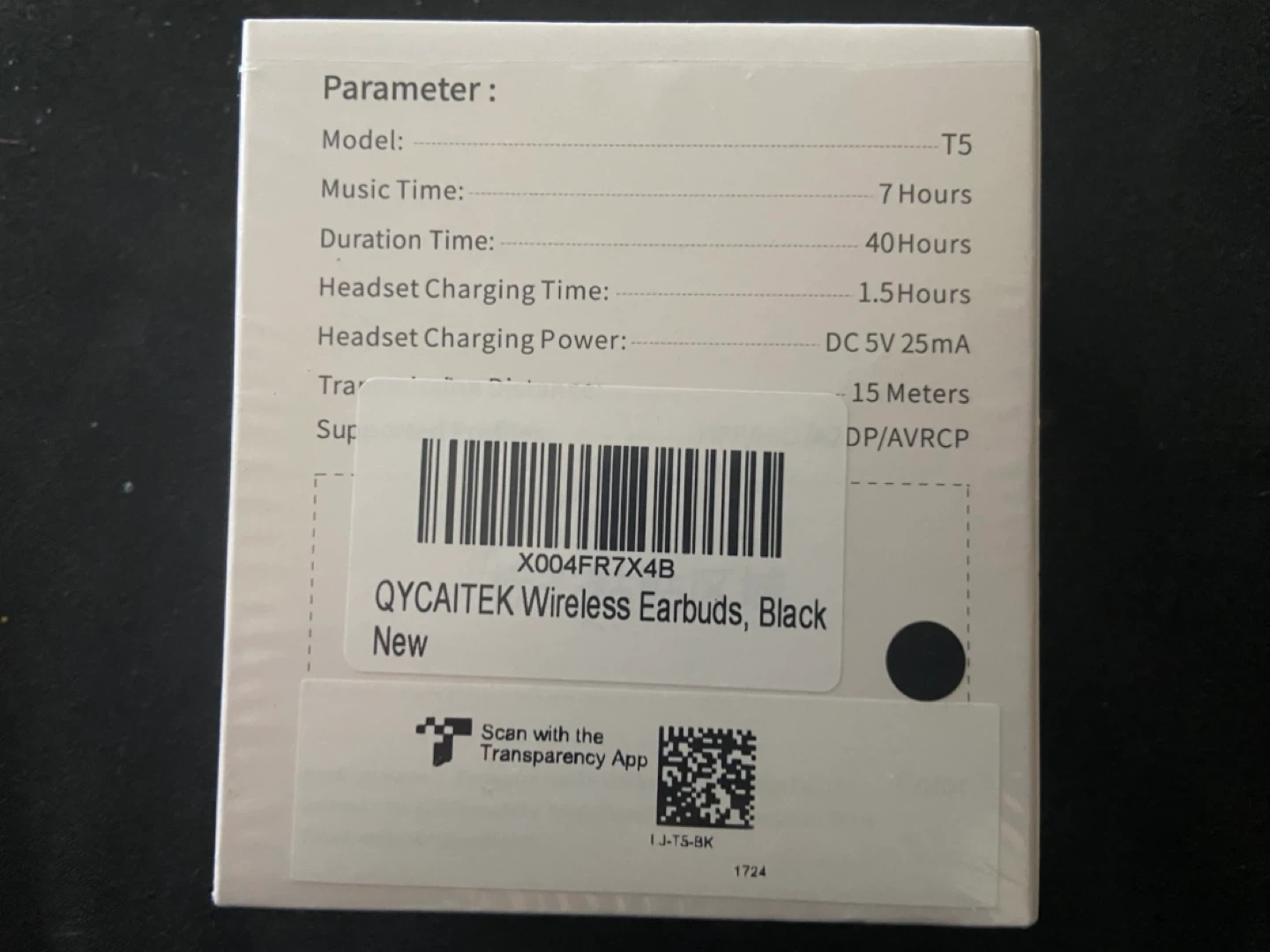 These QYCAITEK T5 true wireless earbuds come in black. They offer 7 hours of music time and a total of 40 hours with the charging case. The charging case takes 1.5 hours to fully charge. Bluetooth range is 15 meters.