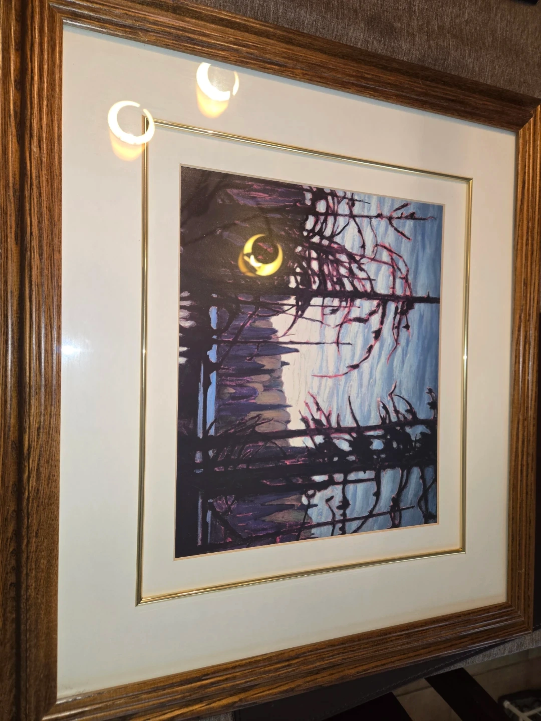 Selling a framed art print featuring a landscape scene. The frame is wooden with a gold trim accent. It is in good condition and ready to hang in your home! Beaver Swamp, Algoma by Lawren Harris a print.